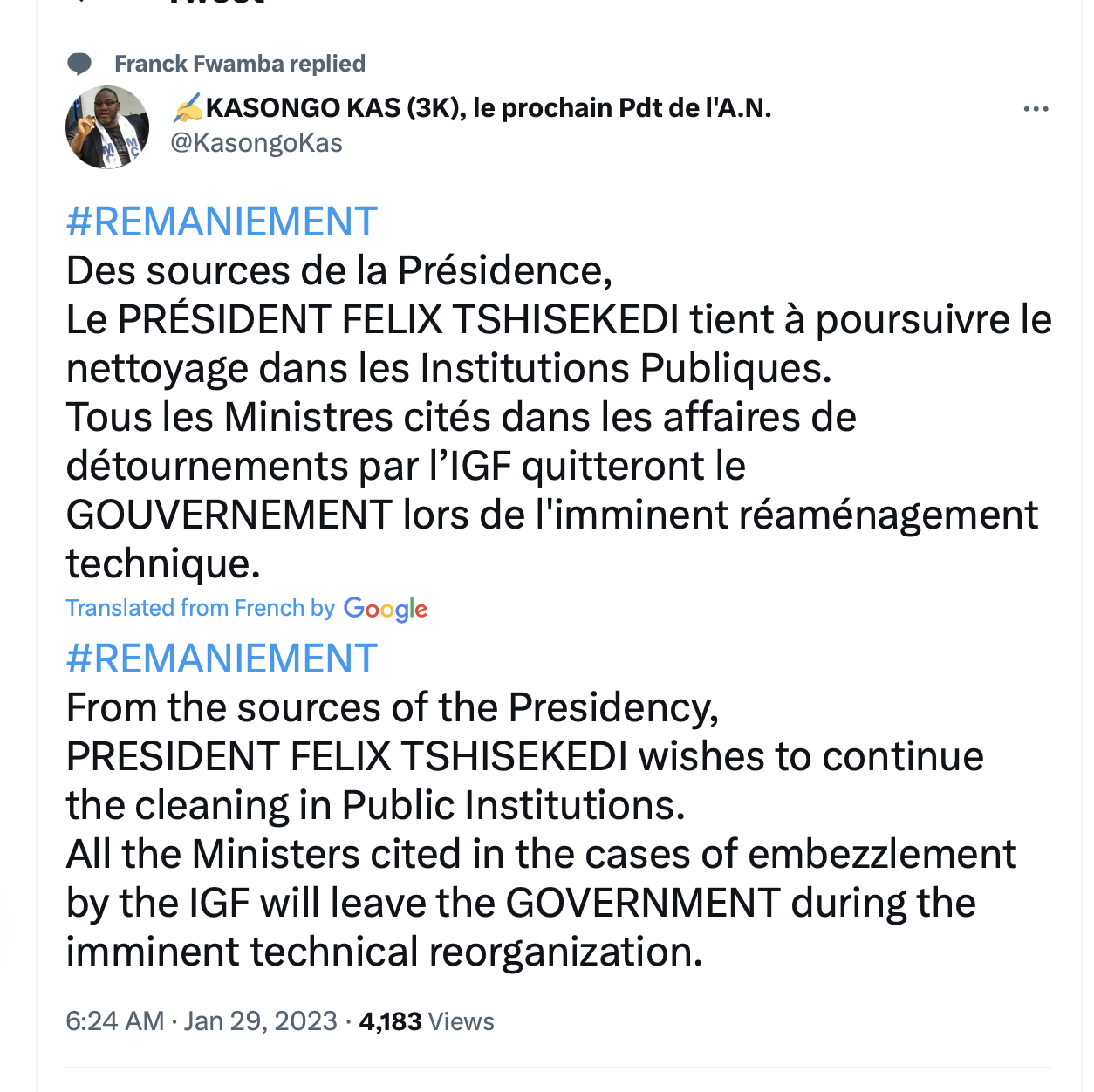 Yea but these things take time, they are rooted in corruption and Mupande has obviously entrenched himself, the advisors Felix has fired would no doubt be big advocates of his so things are looking better and soon Kayinda another Mupande loyalist will be gone.