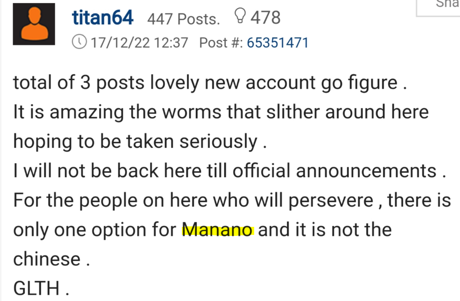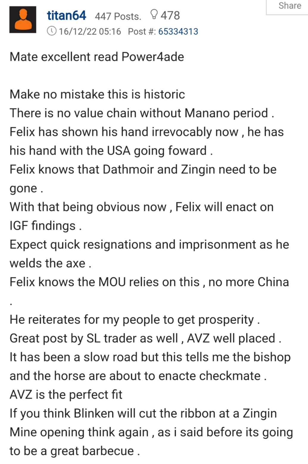 His theory from previous posts is that China won't be involved in Manono because Felix is all in on the gringos. Not sure if he means CATH will be involved or not but it seems like he thinks they won't be from the overall vibe of his posts.