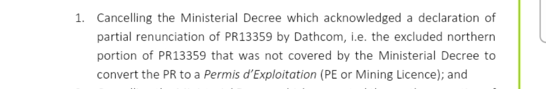 If there would be backup by the government, they would made a new decree or talking about possible steps to help us. Instead of saying that the state can not benefit from a PE because of the conflicts between the shareholders. I told Nigel in a email a few months ago that he please don't fight until we loose it all. I think that will happen. The company is part of the ongoing disagreements, conflicts and differences. I believe the situation would be different when we had work with zijin instead of fighting them. But that is to late now. I believe the drc will take the 13359 back with the reason of the conflicts. The IGF had shoot against Dathcom too, not against AVZ but against the JV. So they will cancel the JV and we have to fight for money in the ICC.