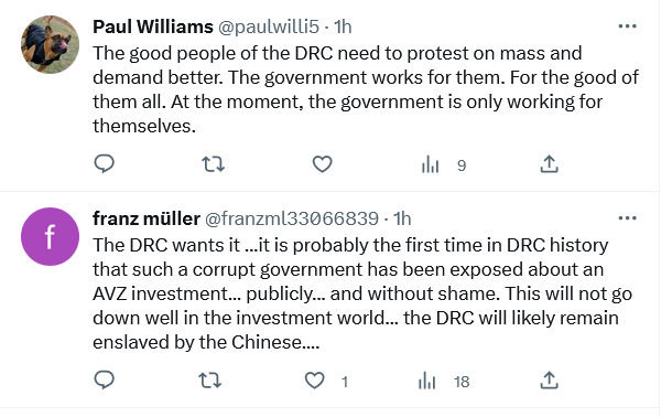 The twitter campaign is gathering support from stakeholders and is being very well supported by locals in the DRC, it has specifically targeted Celestine Kebeya and Zijin which is spot on, but I’m thinking of targeting the government and mining sector as a combined corrupt entity.