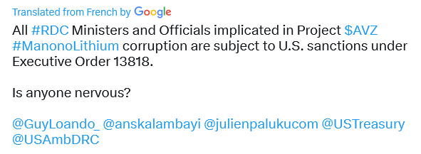 I read through the tweet trail - really about the former Mozambican finance minister being extradited to face corruption charges in USA. Then AfricanMiners implying the same could happen to corrupt DRC officials re Manono. So yes "Could be". IMoDoes anyone have a second source on this? Translation could be: they ARE subject to sanctions; they COULD BE subject to sanctions.