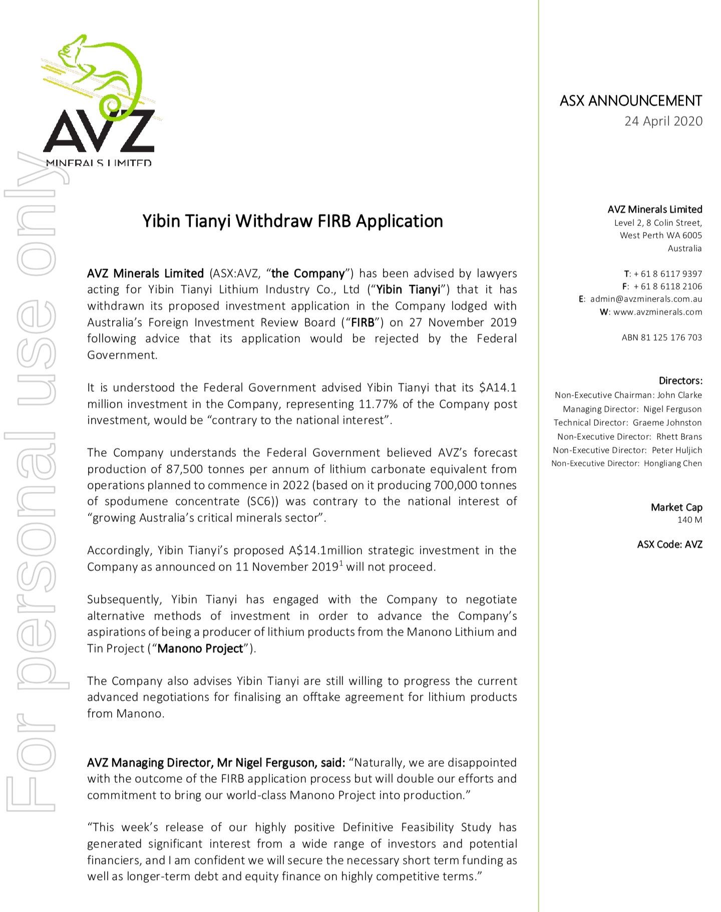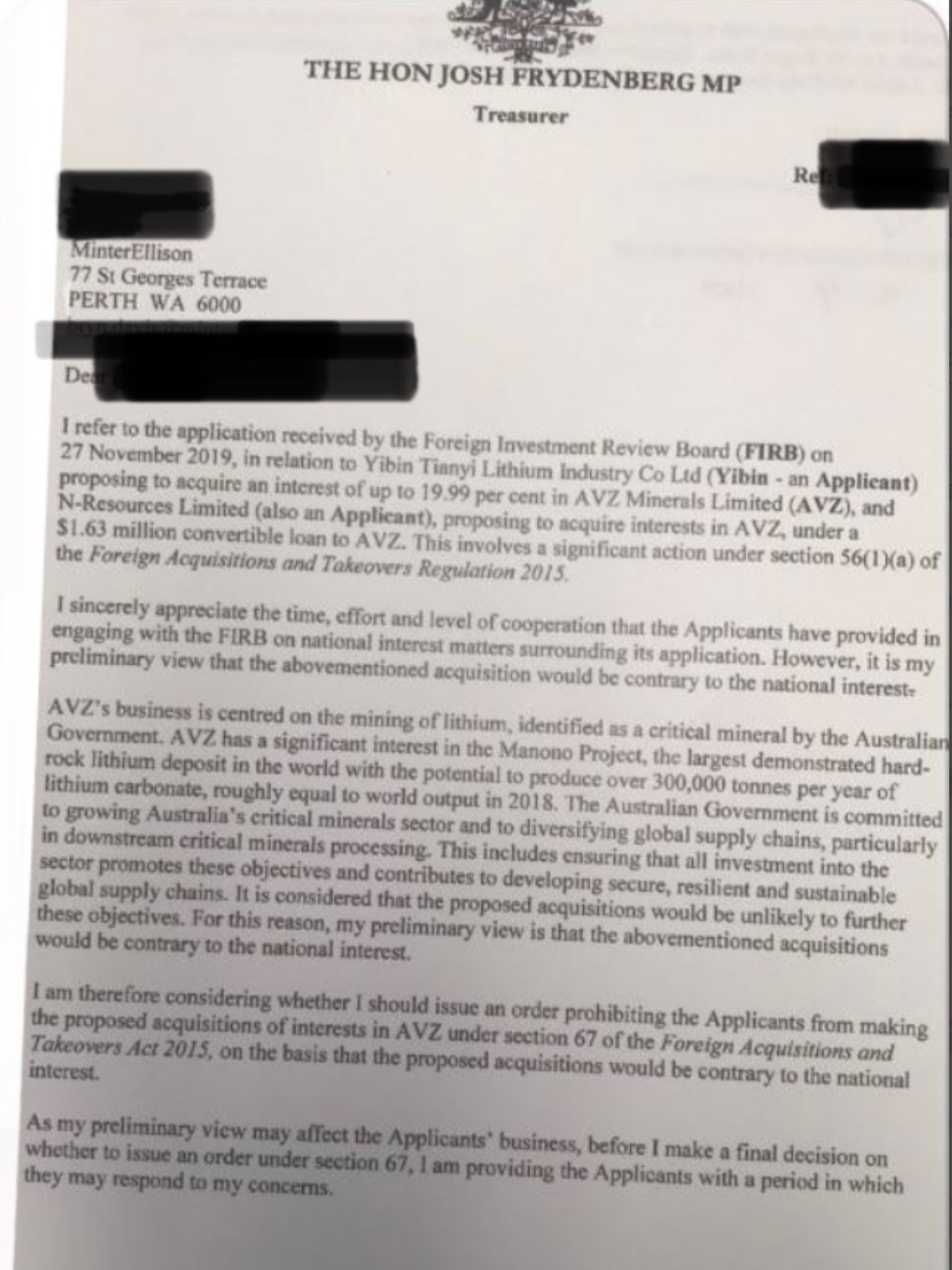 Not sure FIRB would give 2 fucks about the shit show, but would give a HUGE fuck if AVZ ( which potentially has 2b tonnes of high grade spod ) was taken over by chinese entities in particular, in any shape or form..........not to mention the loss of massive tax revenue.
