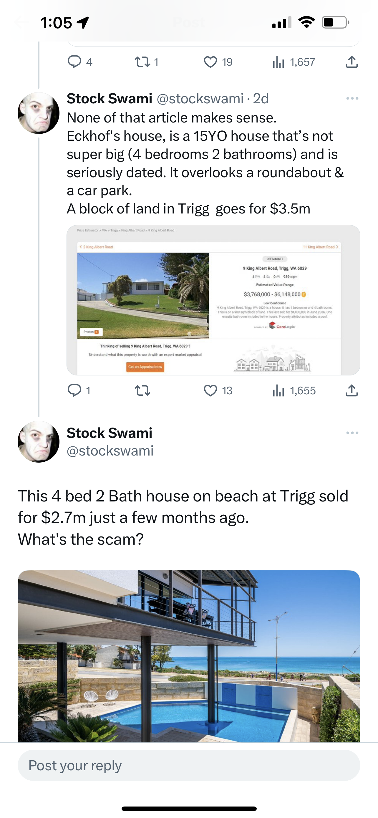Swami is pretty dumb. The house that the estimated value is based on was demolished to build the house that's currently for sale. If he Googled the address he'd easily work that out. But yeah, I can't see him getting $16m
