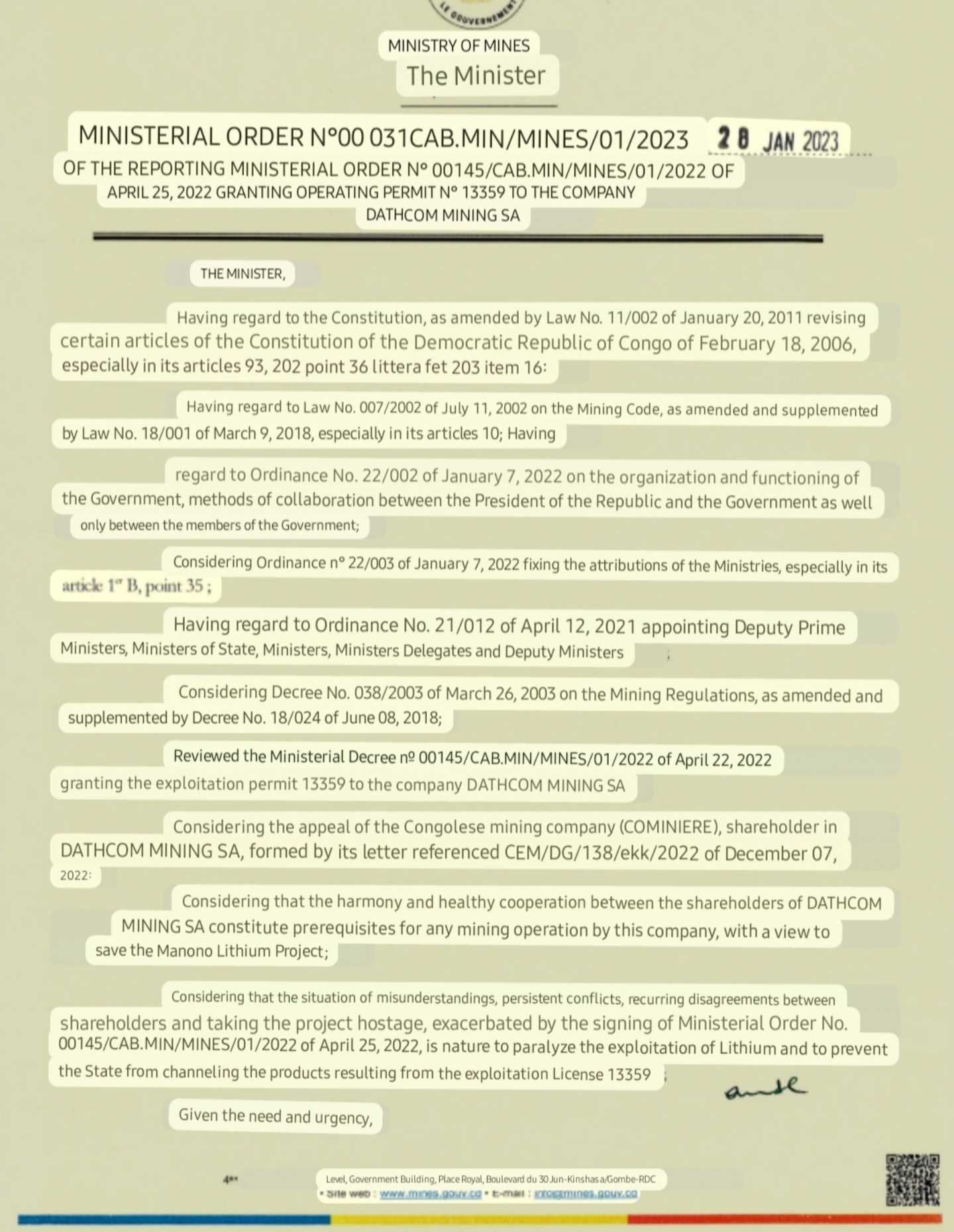 If we win our cases at the ICC then the MoM's reasoning in the new decrees will be laughed out of the ICSID especially given the IGF report and the fact that conflicts between shareholders is unknown as a reason for cancellation of a PE in the DRC mining code. Let them eat pineapples just won't cut it anymore imo. Given the need and urgency.