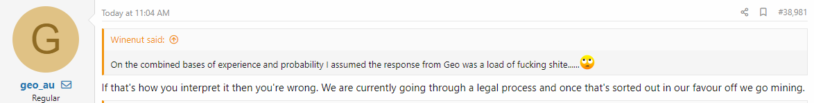 Your original response old boy had nothing to do with any legal processes or proceedings in relation to AVZ and was actually about/linked/and in response to the comment that the MoM reversed her position on 29 absolutely, completely, unrelated mining licences that had "actually" been "granted" and then subsequently "revoked"