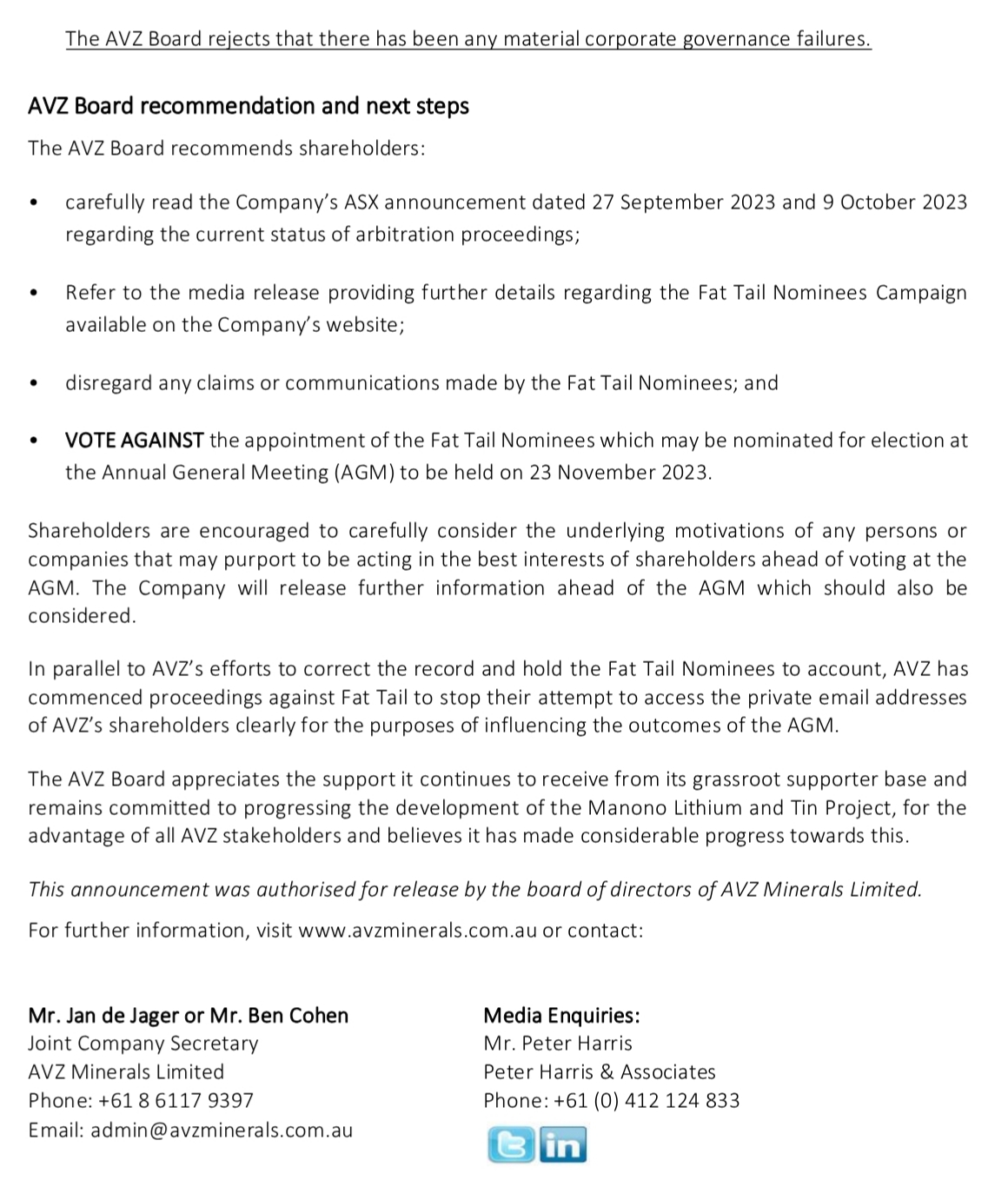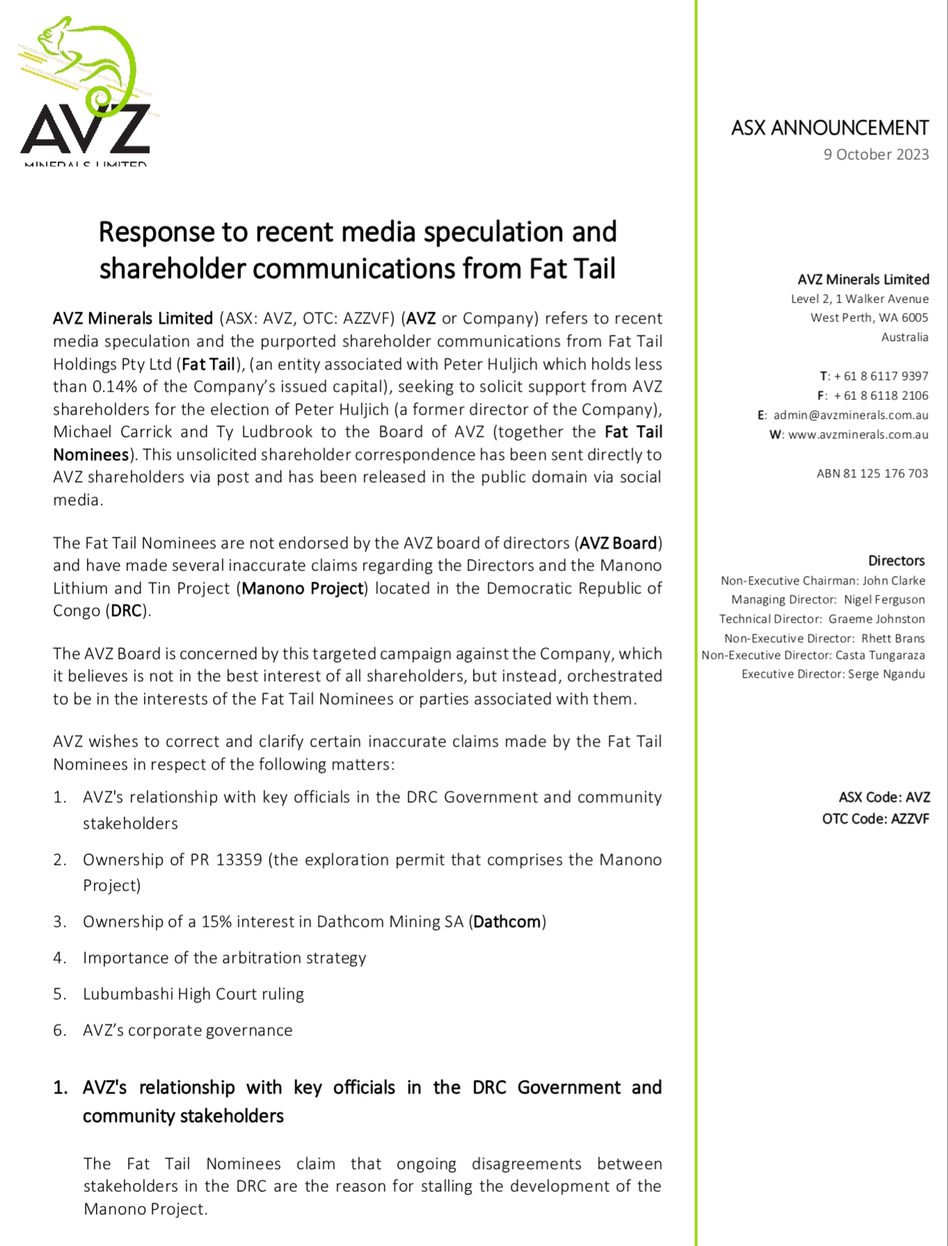 "The AVZ Board appreciates the support it continues to receive from its grassroot supporter base and