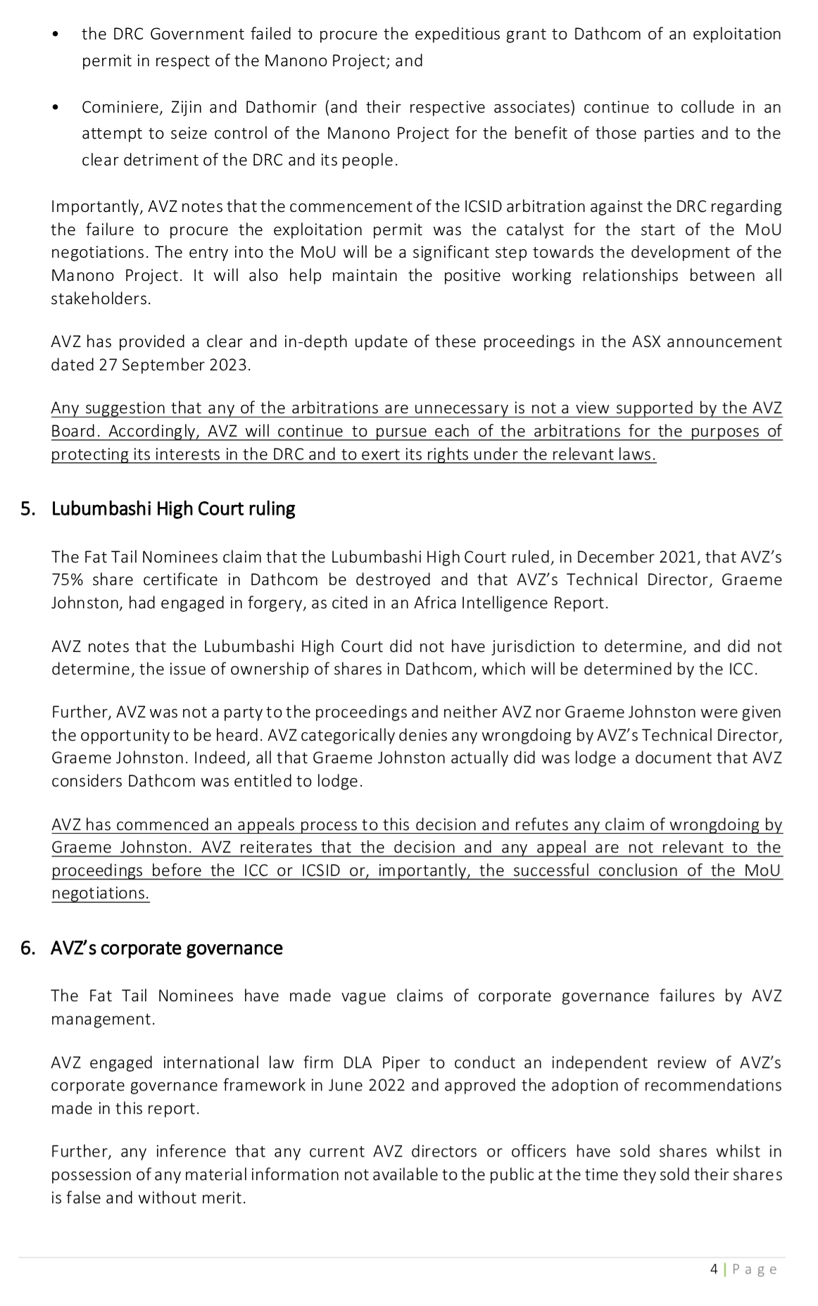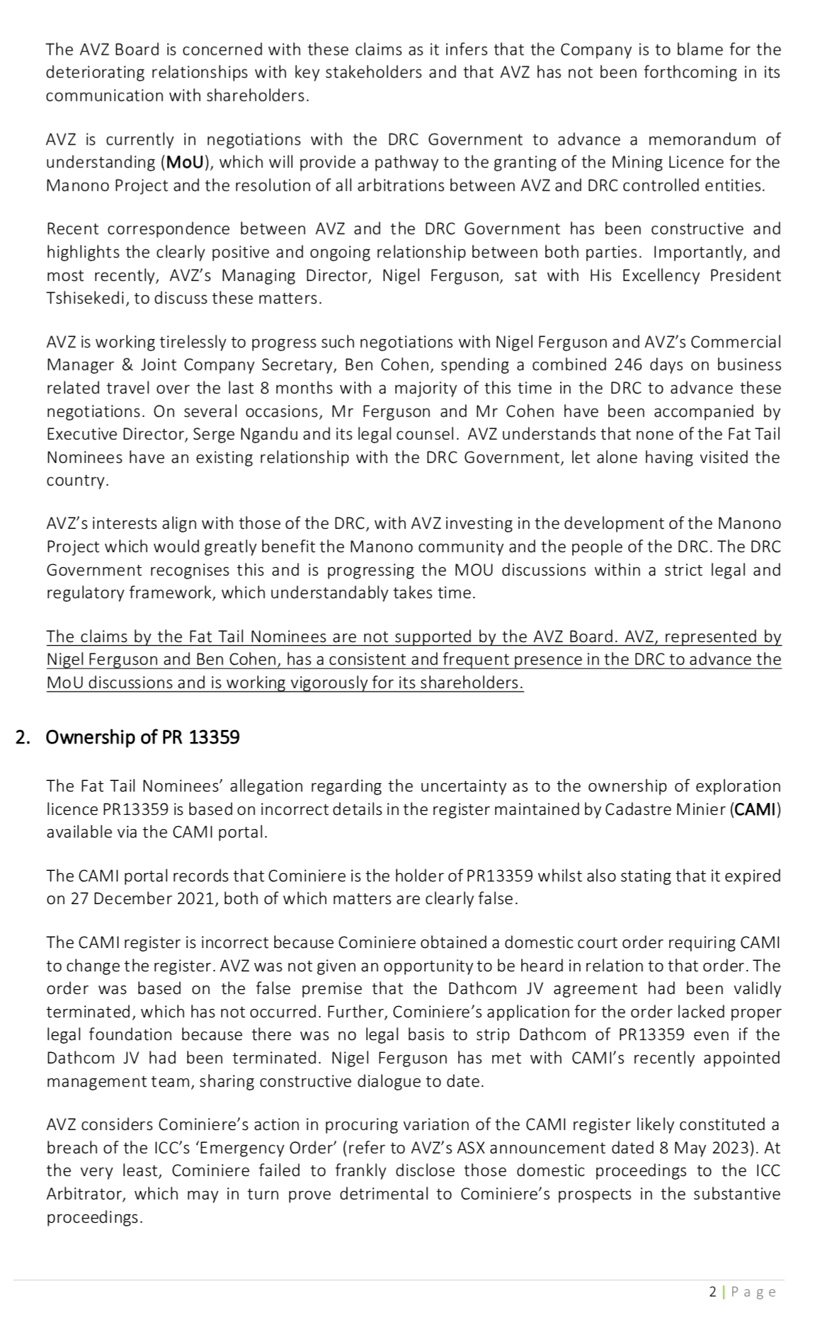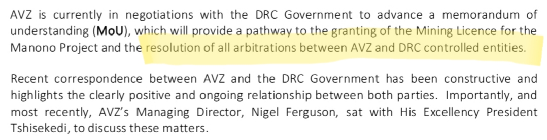 "Importantly, AVZ notes that the commencement of the ICSID arbitration against the DRC regarding the failure to procure the exploitation permit was the catalyst for the start of the MoU negotiations. The entry into the MoU will be a significant step towards the development of the Manono Project. It will also help maintain the positive working relationships between all stakeholders".