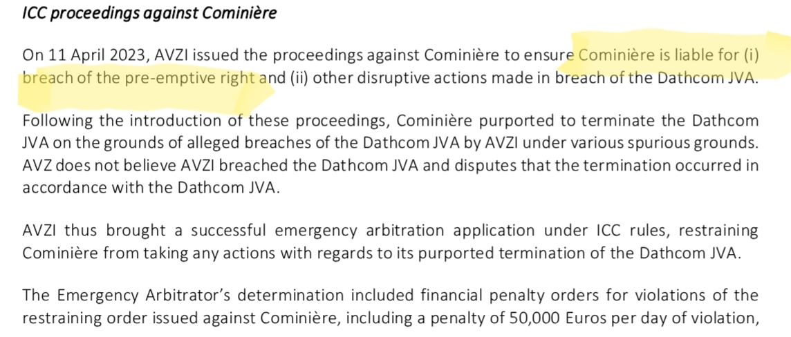 They mean the Cominiere ICC case, which is intended to rule on whether the purported transfer of Cominiere's 15% is valid or whether we should be able to apply our right of refusal, and also to the Dathomir ICC case, which us intended to rule on the validity of the earlier transfer of Dathcom shares to AVZ. Together these should clear up Dathcom's ownership disputes.