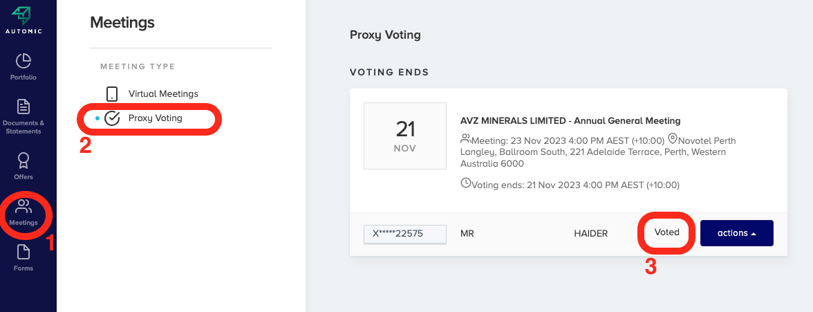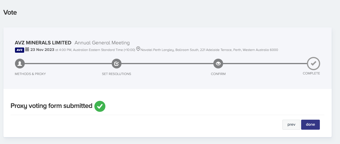 So when I came HOME, I clicked on "Click Here" and went through the same exercise, and on the final step it said, "proxy Voting Form Submitted" could be because my home pc was already signed on for Automic, I dont know?