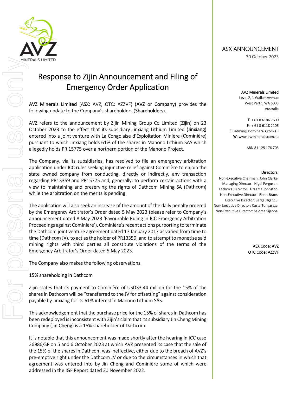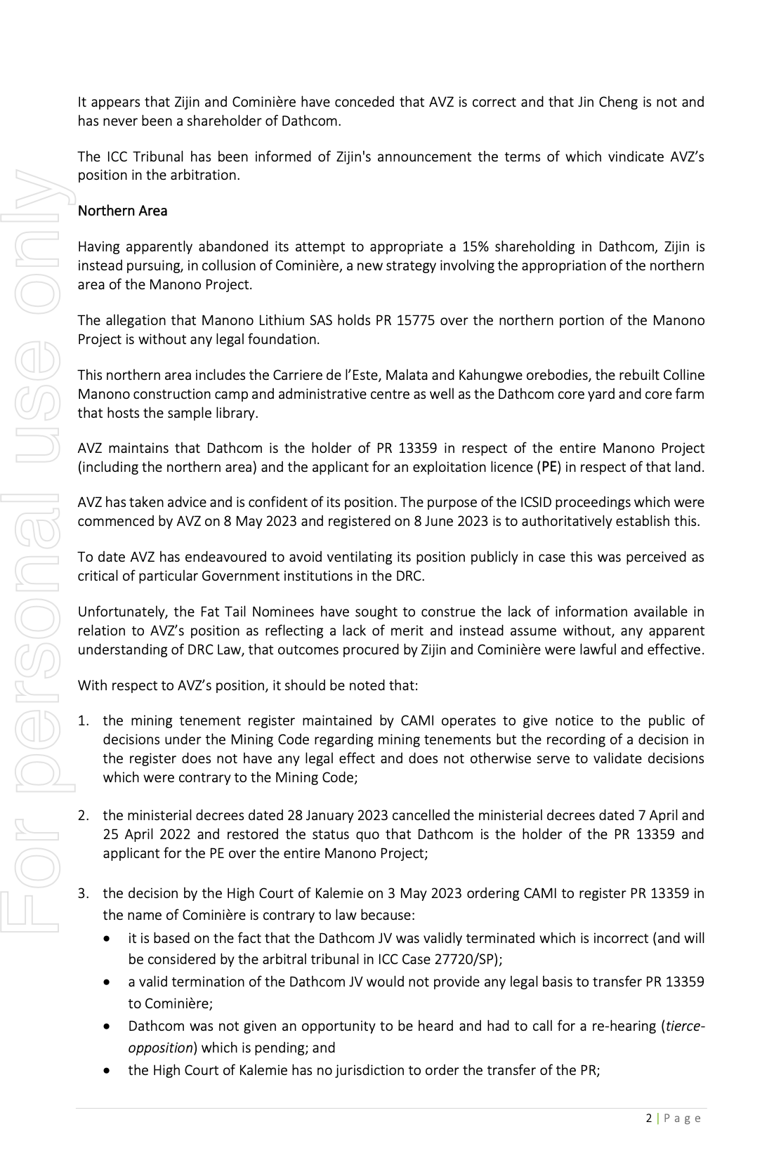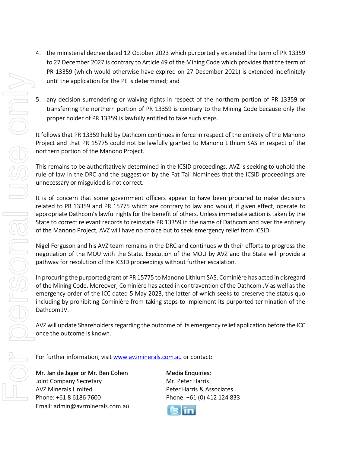 Stating the obvious in that DRC Government ministers are clearly involved in the corruption and 'Unless immediate action is taken by the State to correct relevant records to reinstate PR 13359 in the name of Dathcom and over the entirety of the Manono Project, AVZ will have no choice but to seek emergency relief from ICSID.' 👏👏Encore, encore