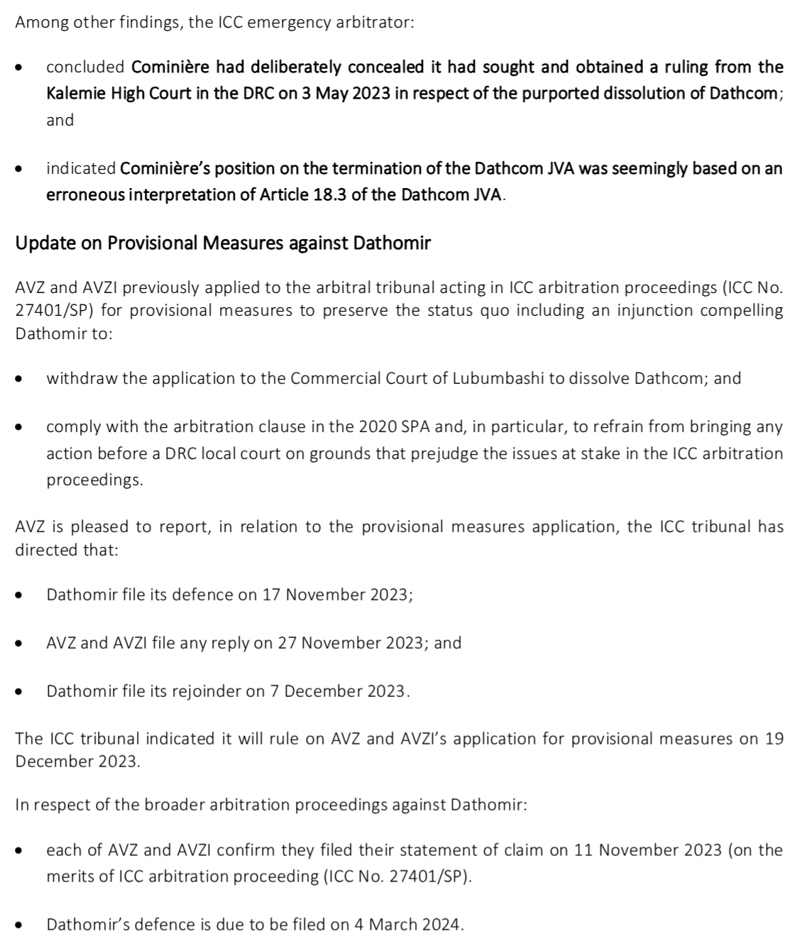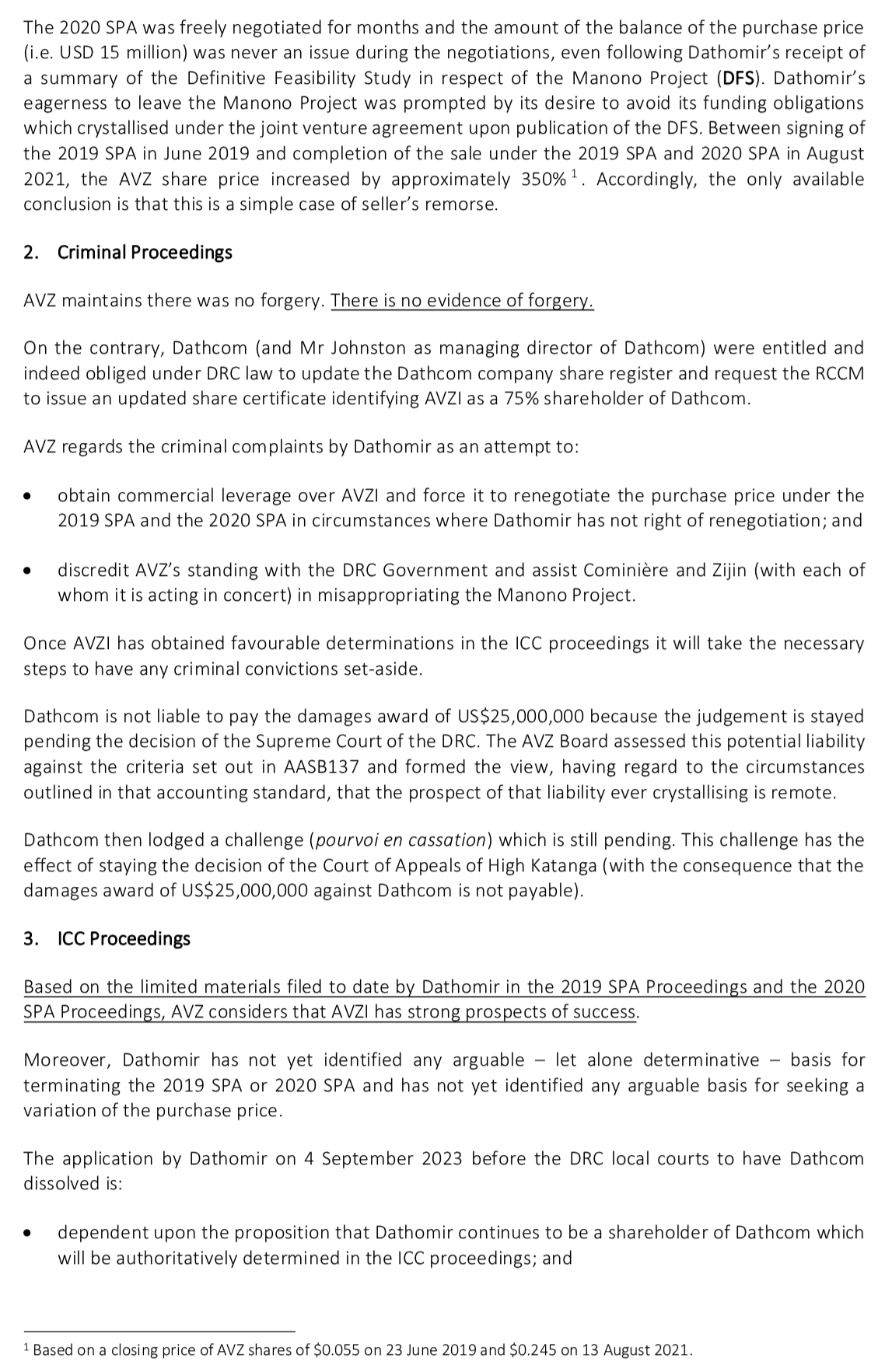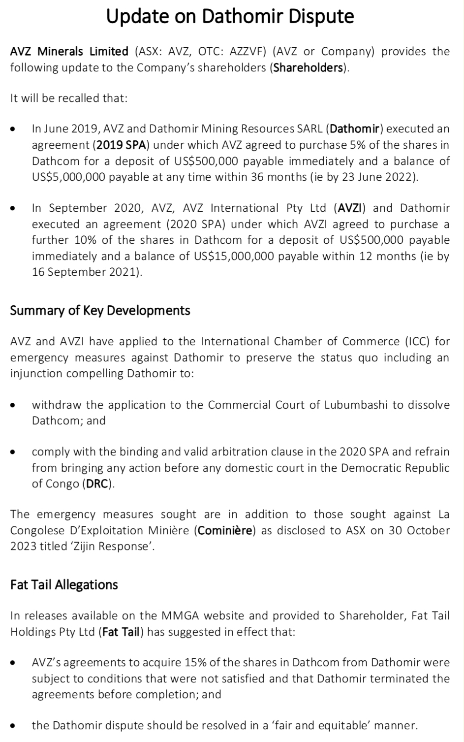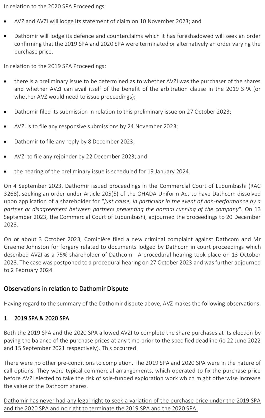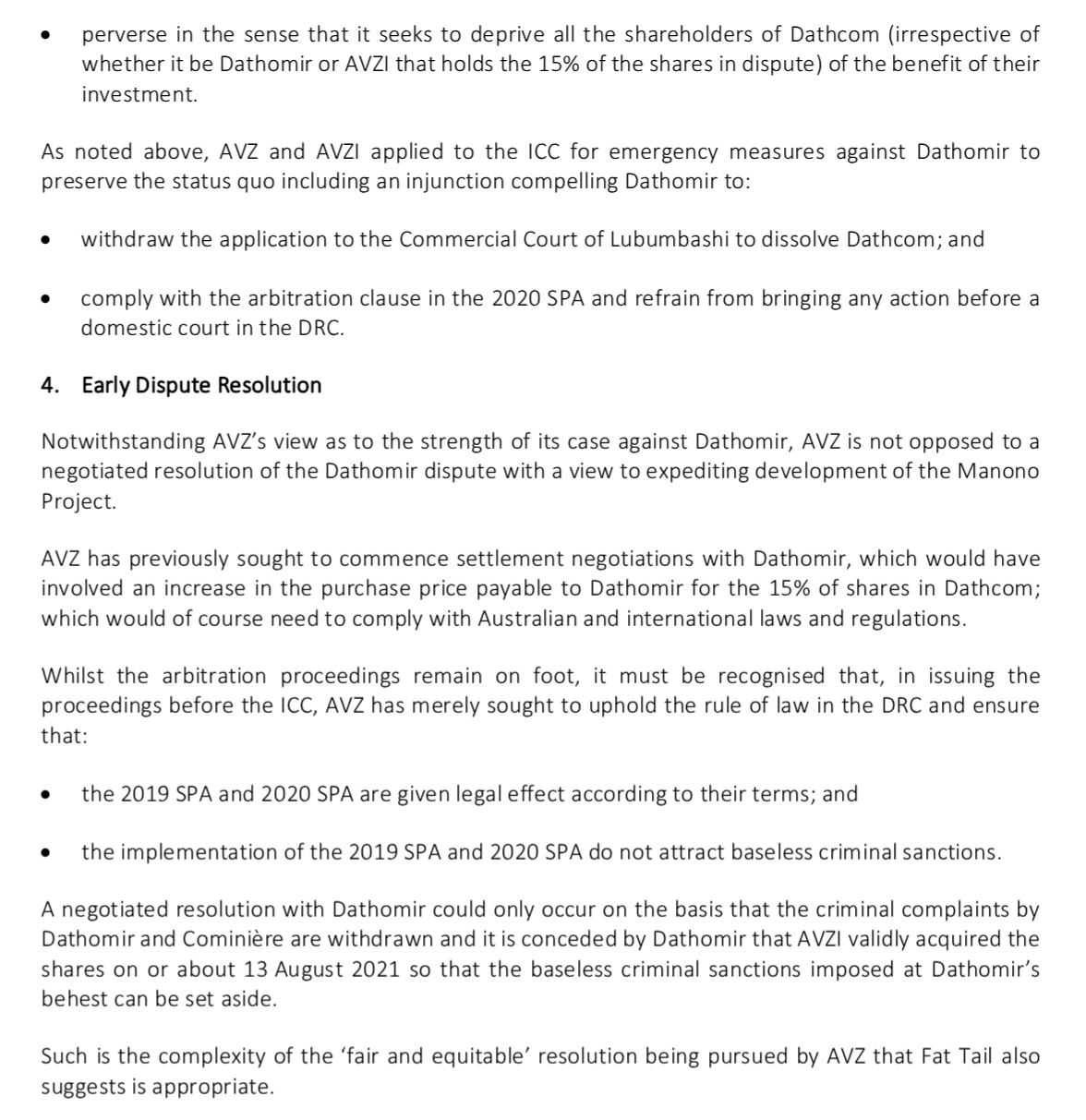 Obviously I would need to read the SPA's to know for sure if Cong has grounds for termination or renegotiation but the fact that both parties have acknowledged that completion occurs on payment, Cong couldn't back up his EGM claim from the agreements themselves and the ICC are hearing the cases and resticting Dathomir's actions within the DRC is enough for me. And DLA Piper too obvs