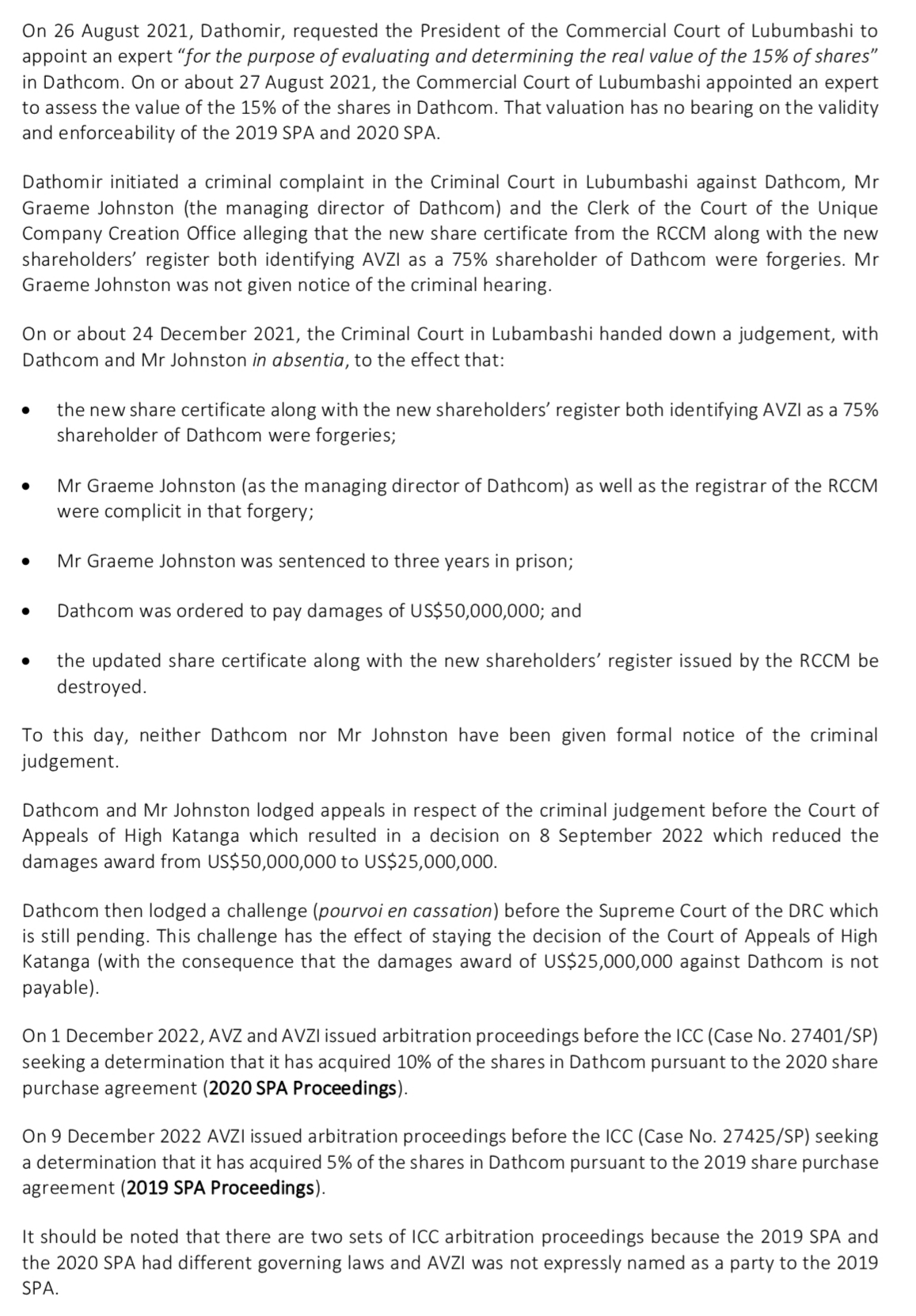 Without going into the long boring details of OHADA the article that Cong cites about waiving the sale is about negotiations using an expert to value the shares in an absence of agreements. The judge was never asked to rule on the merits of his arguments about termination and repeatedly recognises the need for this matter to be heard by an arbitral judge. The ICC taking on these cases indicates to me that they are the ones named in the SPA's for dispute resolution just like in the Dathcom JVA and they have agreed with AVZ on everything so far.