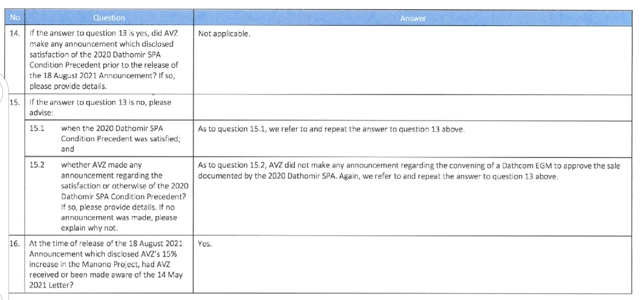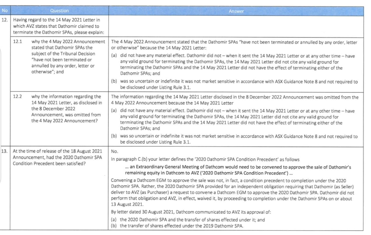 As for the need for a Dathcom EGM this was not a condition precedent of the SPA's according to AVZ. Cong says it 'should' have happened because it occurred in previous transfers but he doesn't cite anything from the agreements when claiming this.