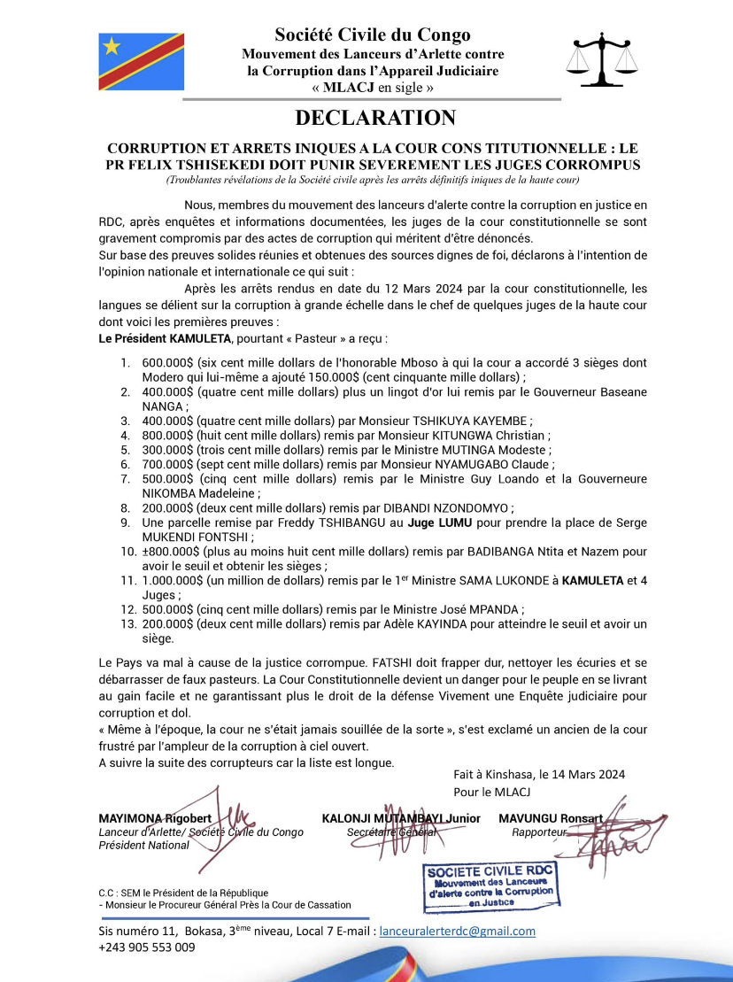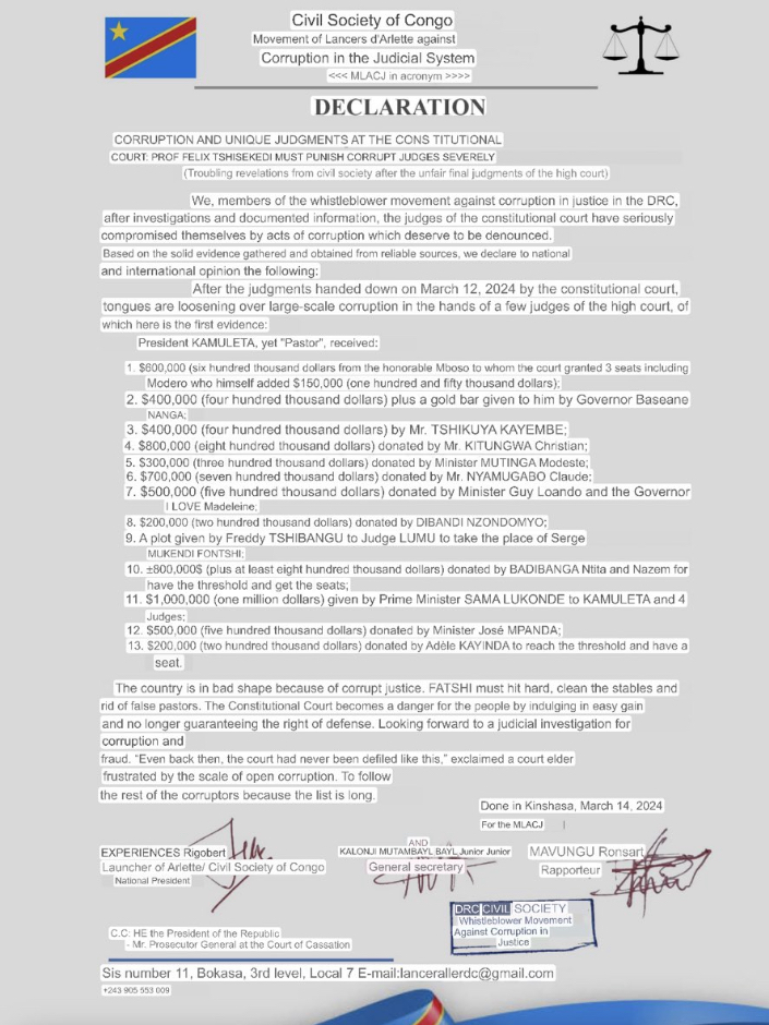 for JUSTICIA Asbl, for example, within the framework of the agreement reached between Gécamines and the Chinese group CMOC, the government should clarify the share which would accrue to the inhabitants of Fungurume and Tenke of the sum of 800,000,000 S that TFM would pay at Gécamines.