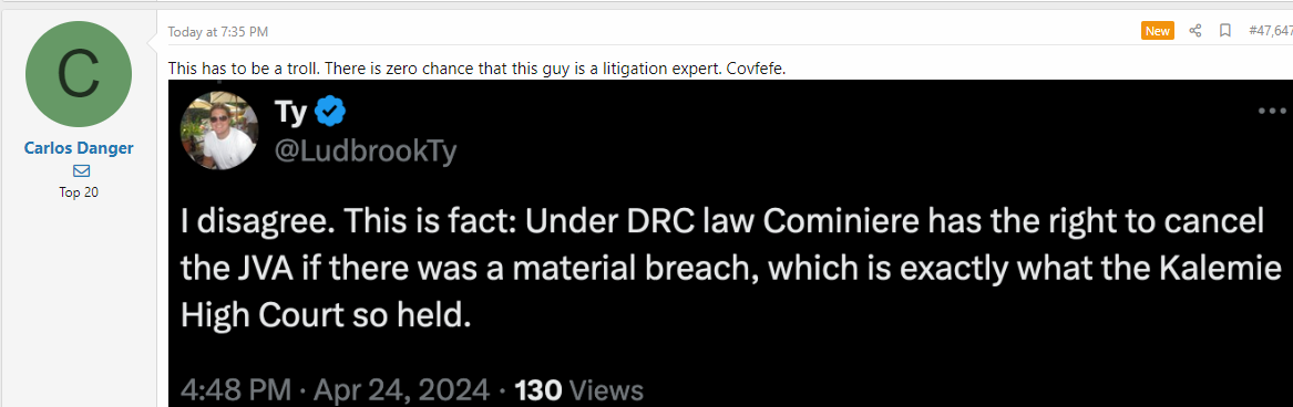 He already tried litigation against AVZ, which got him nowhere, he has tried making contact with various shareholders and pretended to be someone else (JAG can confirm), has colluded with Cong and is now colluding with Math and the stooges. The other duds are most likely short sellers like boatman and other conspirators paid off (or promised shares in the case of the stooges) by Cong and Zijin.