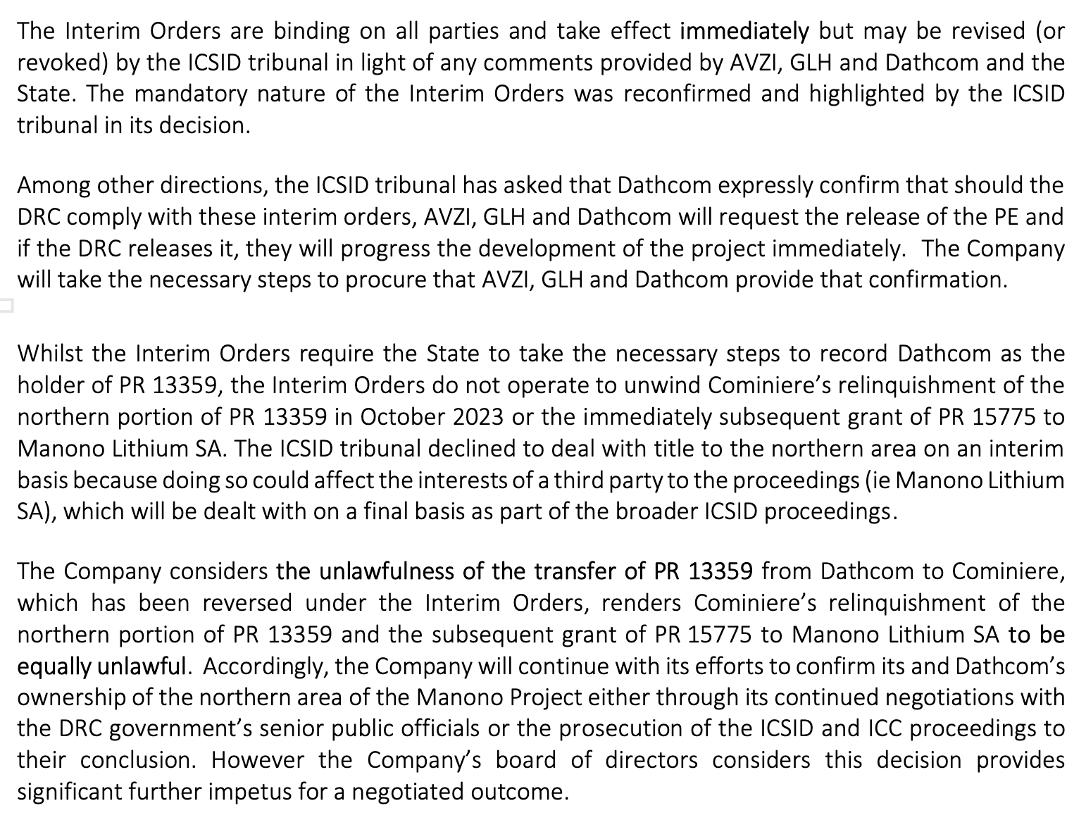 The surviving legal effect of the Dathcom waiver not so much imo. But hopefully someone can prove me wrong on that or we don’t need to ever find out and an alternative outcome can be reached as the latest announcement indicates by saying ‘AVZ will continue to seek value realisation opportunities for shareholders, including through the resolution of the prevailing disputes and development of the Manono Project, admission to a recognised stock exchange and/or partial or complete disposal of one or more assets’. I also agree that a negotiated outcome or a partial or complete disposal of one or more of our assets should be easier to achieve without the inherit complications for the company while operating as a listed company. I support the bod and fully accept the path that voting for them at last year's AGM brings. I just think that the herd mentality is hurting us when it leads to key decision makers social media accounts being spammed aggressively with nonsense. As Nigel said, be respectful. And the most respectful thing we can do as shareholders is strive to be as factually accurate as possible in what we say imo