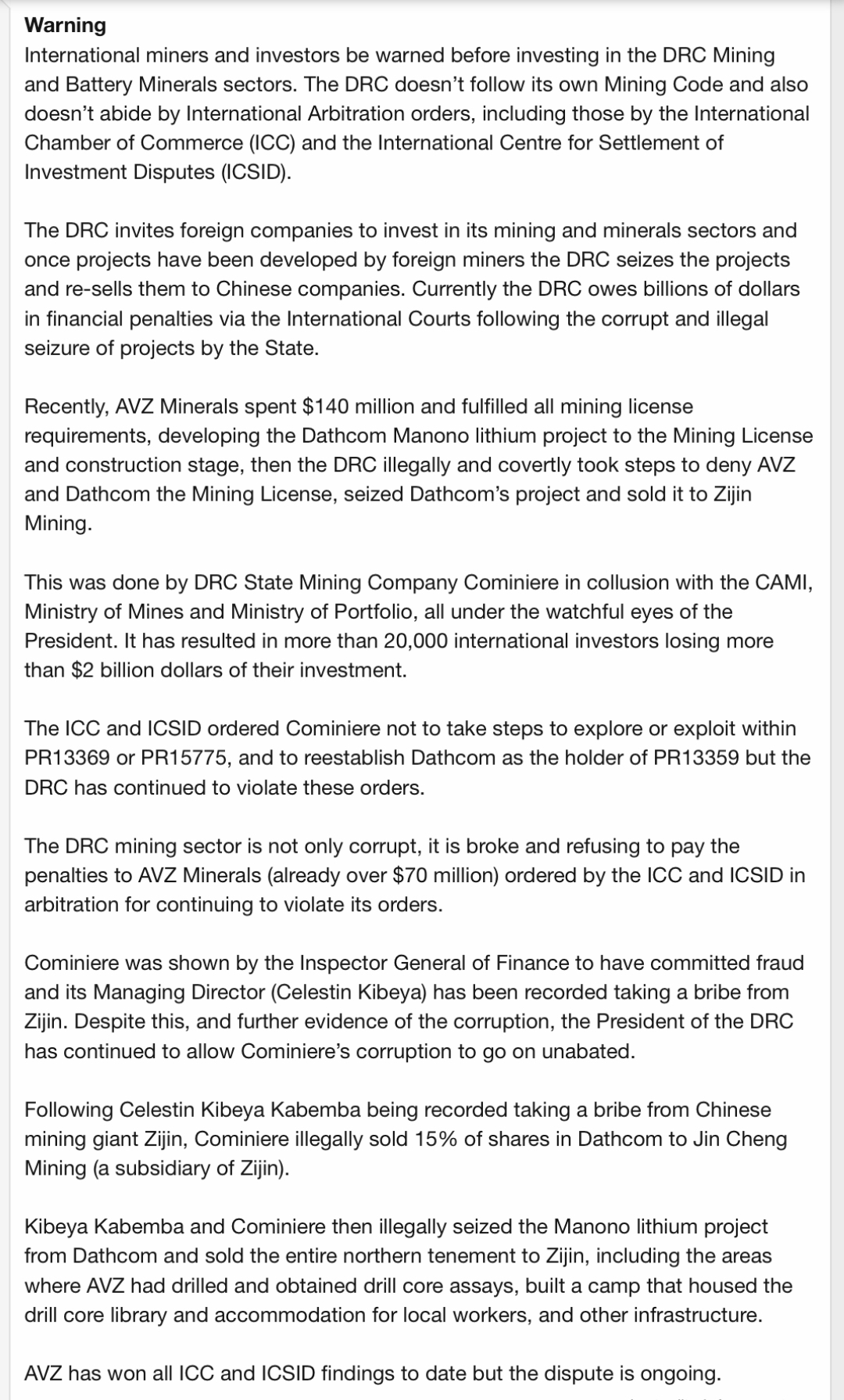 View attachment 62420 Well I'm a top fan of DRC mining week! Just notified 25 of the top sponsors about what happens in the DRC after you spend $100 million on defining a resource! Truly staggering that they expect to attract foreign investors into a cesspit of corruption and Chinese pillaging.