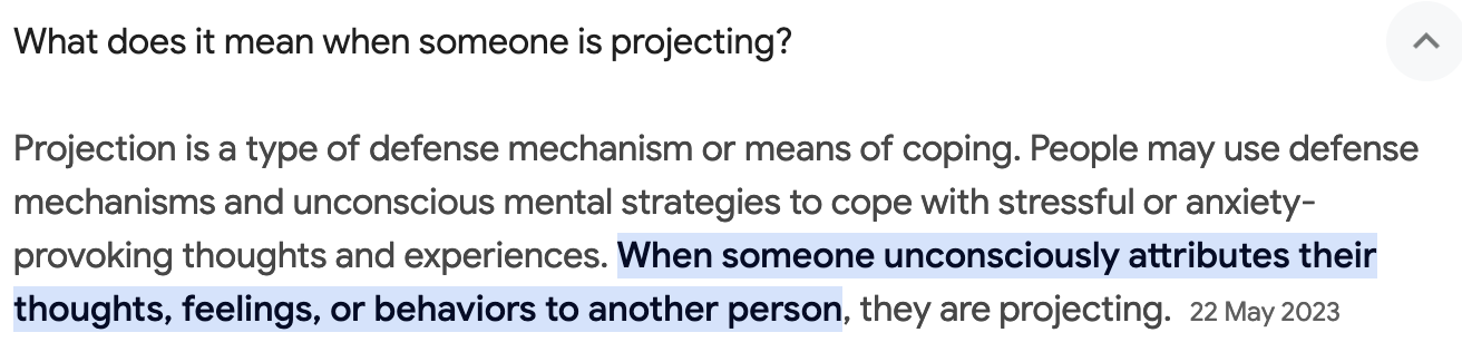 For example "projection, the psychological impulse to project on other people what you’re actually feeling".