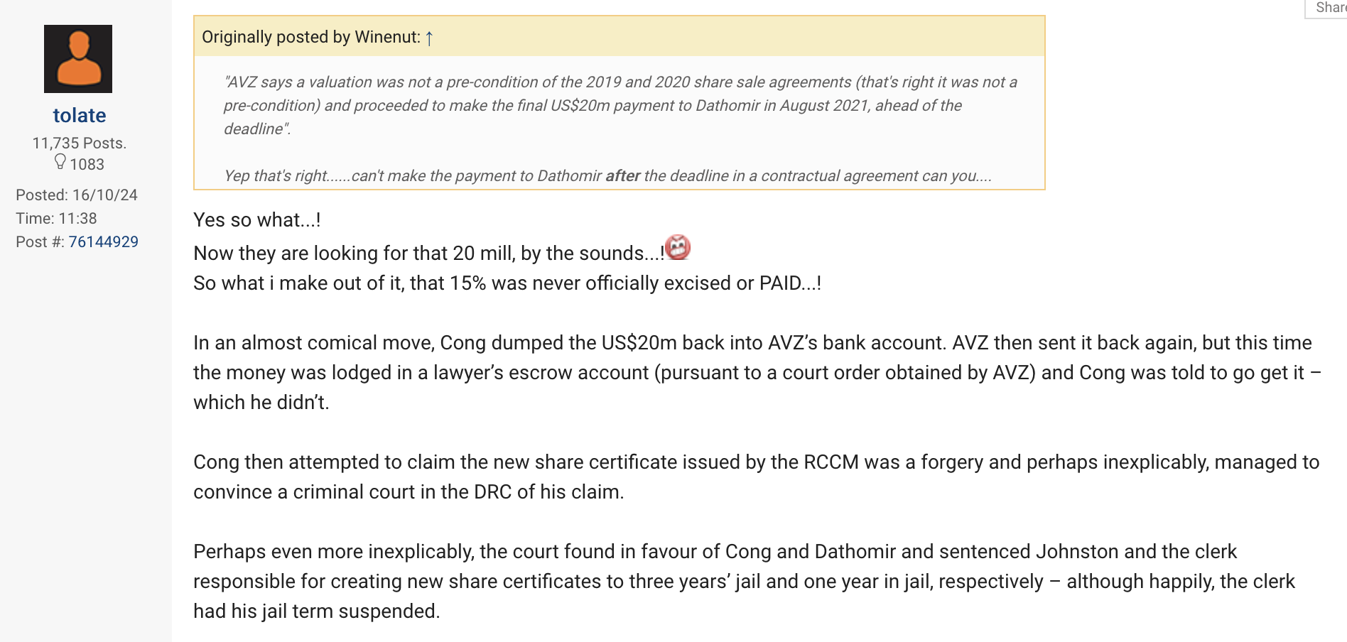 I’ve been saying this for a long time. The requests for escrow balance checks from AVZ to Christian Lukusa line up 1 to 3 weeks before Locke updates in official announcements and the first mention of the need for an ‘appropriate security package for the facility’ was just 6 days after ‘Mr Lukusa demonstrated suspicious resistance’ to communicating information relating to the account. Nothing else makes sense imoI'm guessing we had told Locke they'd be first in line for any recouped cash, and that Locke considered the 20m sitting in escrow as the most likely form of on-hand security for their loan (due to likelihood of Cong losing out at ICC and needing to pay compensation), but as those funds may now have gone up in smoke we are at a loss to provide Locke with any collateral for their loan.