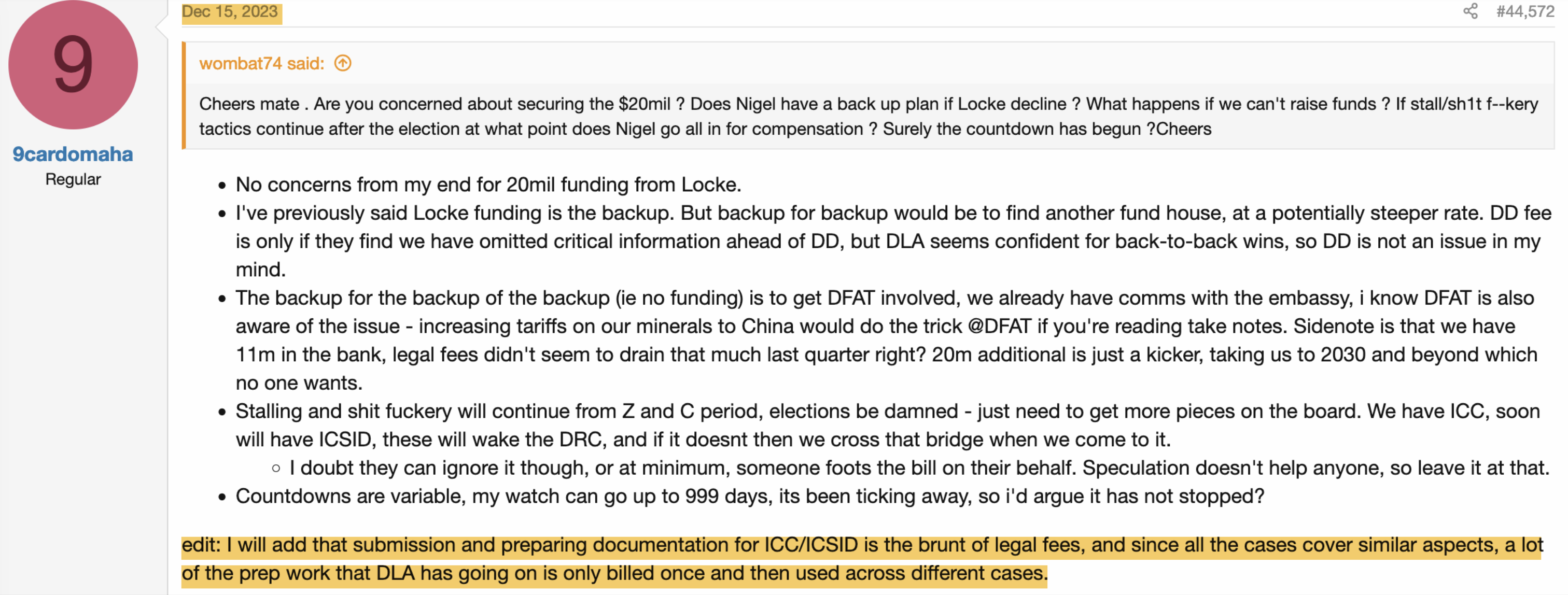 There hasn't been a mention of Locke for a while now, I don't think it's proceeding unless it's all happening behind the scenes under darkness.Not sure exactly but I reckon the 20m USD agreed with Locke should cover it. 9card told us that a significant part of the costs for legal was in prep work and that can be used between the cases so funds needed on that end should be reduced moving forward. But obvs paying 7 board members to '2030 and beyond' (funny no one got up in his grill for saying that lol) is going to be a drain on the purse imo