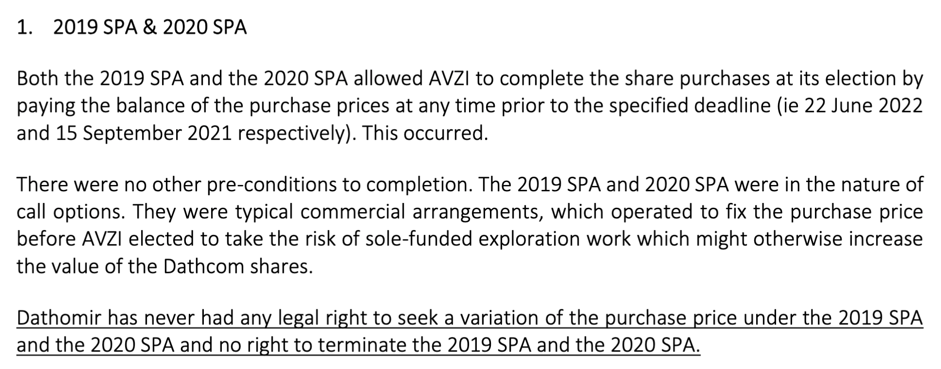 A legal right to termination is defo not in the SPA's according to AVZ, so Cong's only potential right to termination would have been under Article 11.1 of the Dathcom JVA which says disputes must go through the ICC which is what AVZ have done to put an end to Dathomir's claims