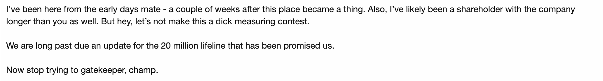 I’ve been here since day 1 Cumsquat. Heard it all to many times now. Shh don’t upset them on socials, AGM’s no questions/no answers,Hoots going from hero to villain, too late and stick shift baiting etc etc.So yeah just voicing my opinion like most others here . Good luck to all stuck in this vacuum of silence.