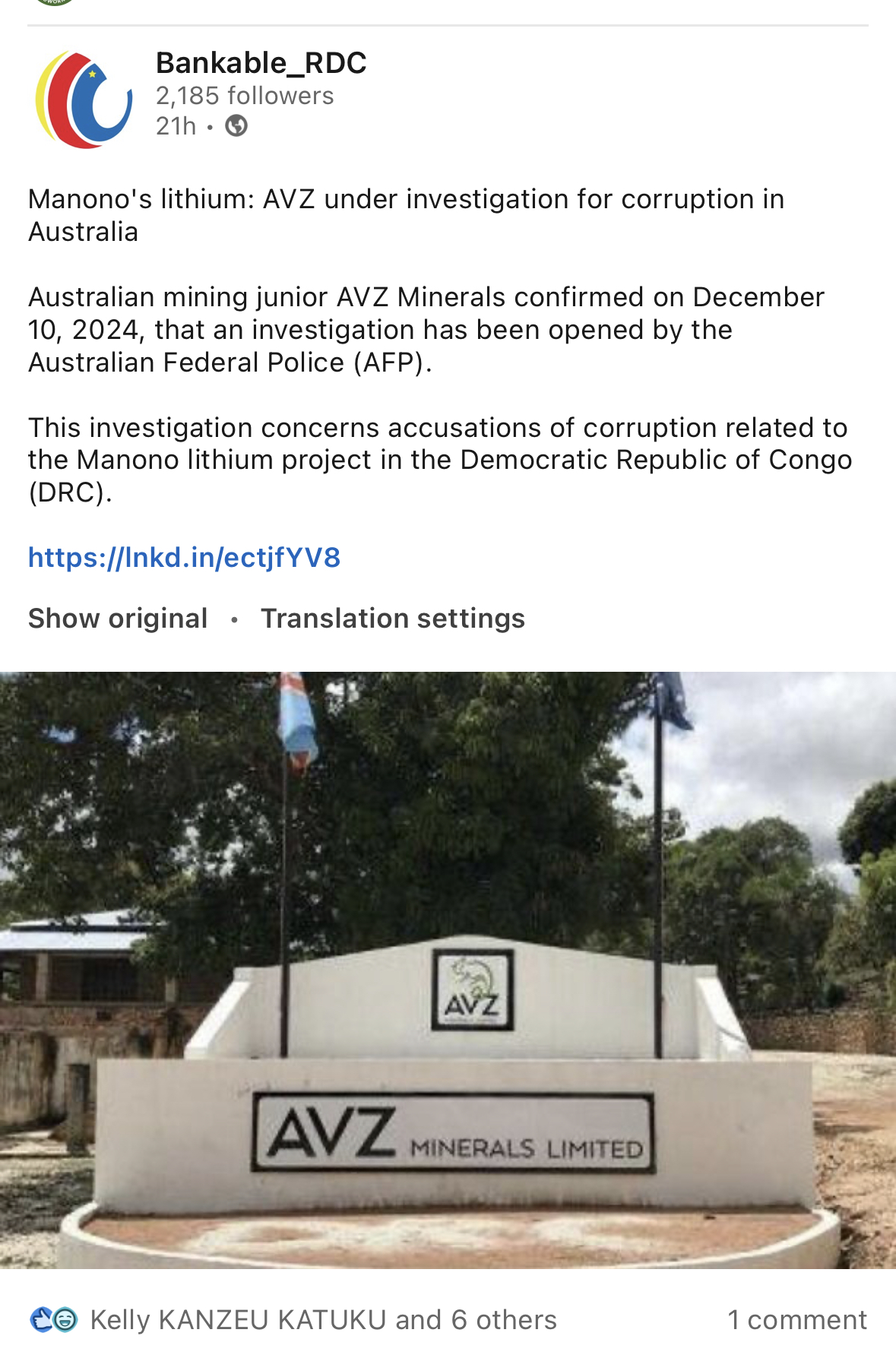 Hey Juba or John or whatever the fuck your name is, have you considered this cooperation with the AFP could be a masterstroke by AVZ? Using the AFP free of charge to clear them of any corruption allegations and creating some clear air to progress past the mudslinging by the DRC and Zijin at the ICC and ICSID - well played by the BOD and their lawyers! Bring on the first tranche!