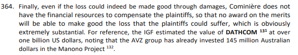 If it hasn't been noted before it means Dathomir will be joining with Cominiere and Jin Cheng / Zijin in proceedings against AVZI accusing us of breaches of the Dathcom JVA