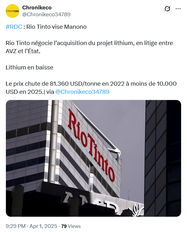 Rio, which is betting big on lithium, has since had talks with the DRC about the future of Manono and there is speculation it could join forces with KoBold in any development.