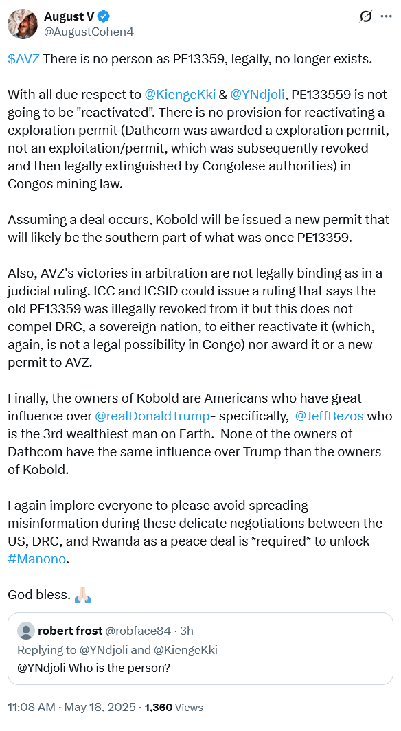 August’s other point that KoBold will be granted a new licence makes absolutely no sense under the DRC mining code as they would need to go through the DFS process again before applying for a new PE