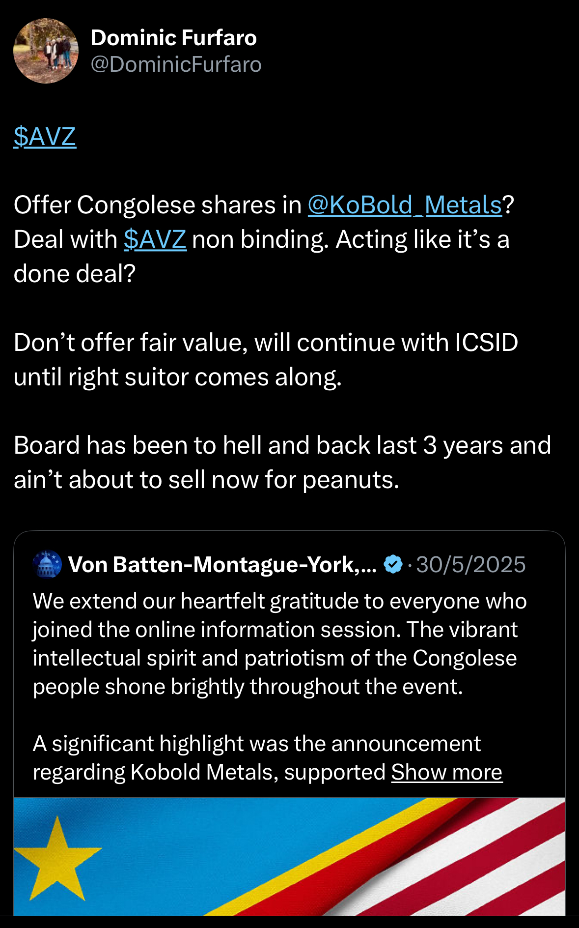 Wrong approach to take. AVZ had planned to likewise work with communities at a grass roots level, including plans to help tool and upskill artisanal miners, before it was illegally seized by members of gov who put personal enrichment above the countries gain. AVZ are not the bad guys here, posts like "pay us or else" besides being against our BODs cautions (and therefore against our best interests towards working with the very people being insulted), just make AVZ look like everything our detractors accuse us of.