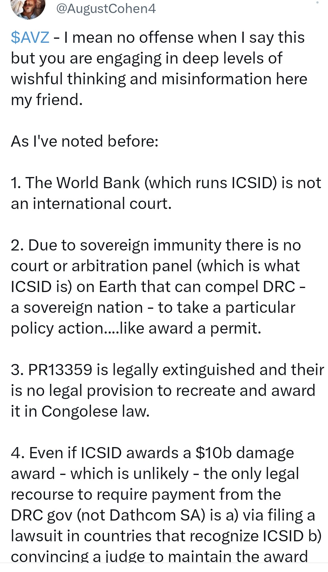 I think the DRC and China are not just delaying AVZ in the courts to bleed them dry, but also trying to outlast the Trump Presidency and hoping they don't get Vance afterwards, as they are both willing to throw around the weight of the US military to make the DRC comply.