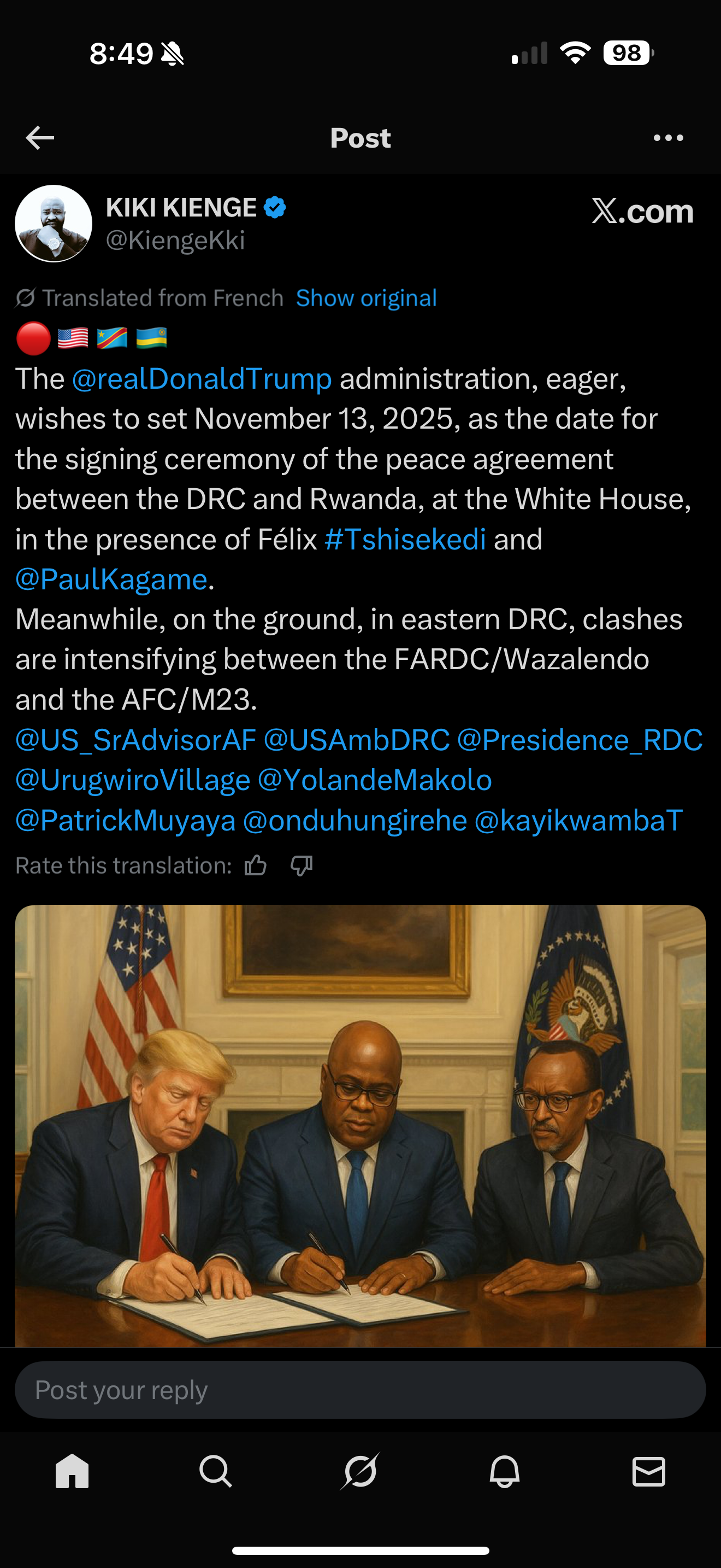 I'd say a lot of the anti-DRC narrative appearing on twitter lately is originating in Rwanda, to prop up Kigame's messaging. I wouldn't place too much weight in it. Though given Trump's desire for a Nobel prize and his regular refrain about how many peace deals his administration had fostered, in this instance some US pressure to sign in time for a well-publicised event at the White House would be credible