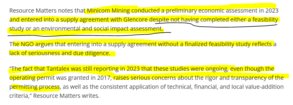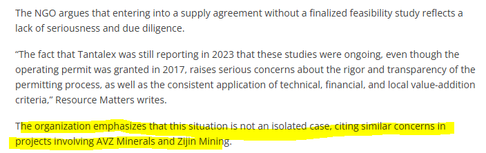 Agreed the article raises issues with transparency of the system on the DRC side but I thinks it's been well proven that AVZ completed all the mining code requirements in the most transparent fashion in relation to PR13559 and I still assert it is unfair to be tarred with the same brush as Tantalex and Zijin in that regard