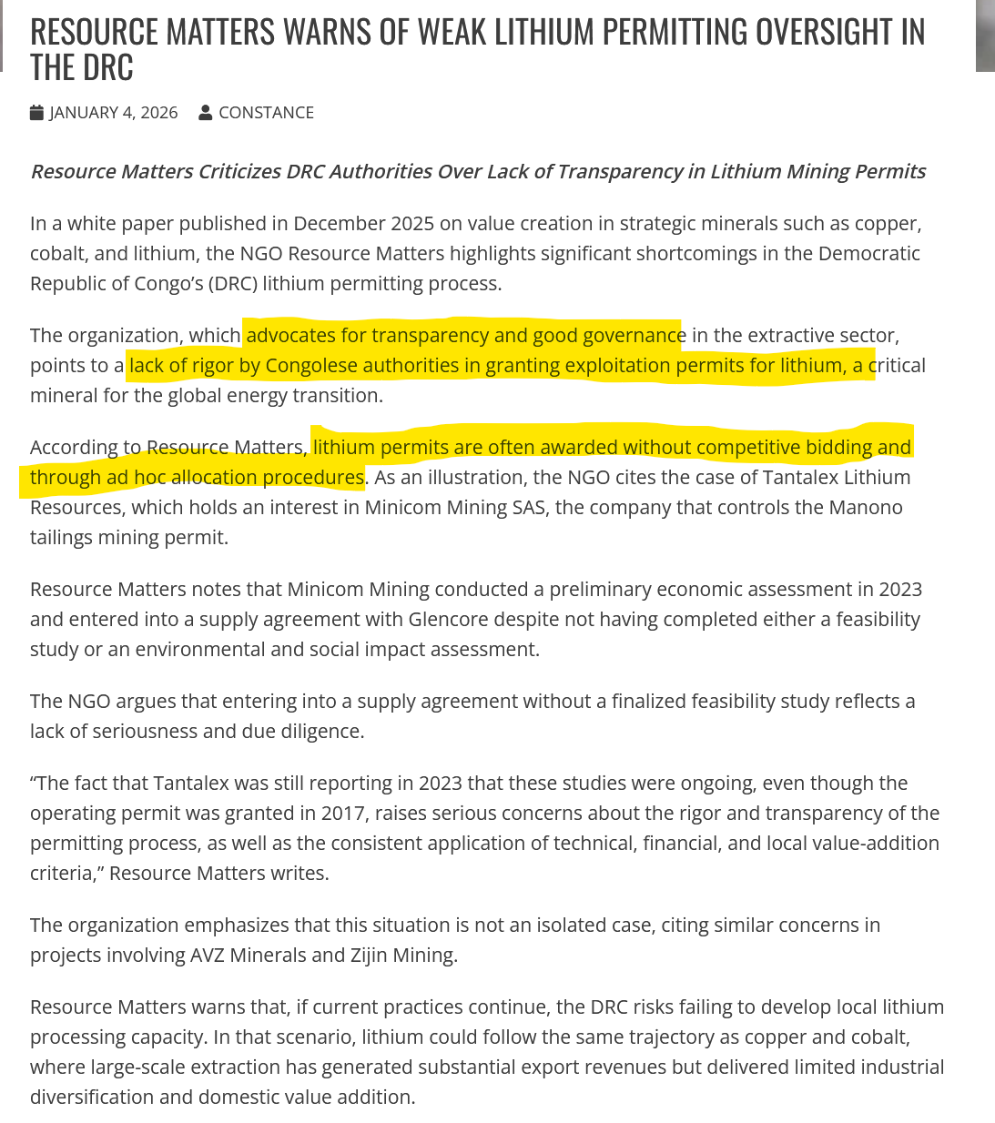 The article says "lithium permits are often awarded without competitive bidding and through ad hoc allocation procedures" - Yep, spot on. This sounds like exactly what happened at Manono, where Manono Lithium/Zijin were given a mining license through an "ad-hoc" process.