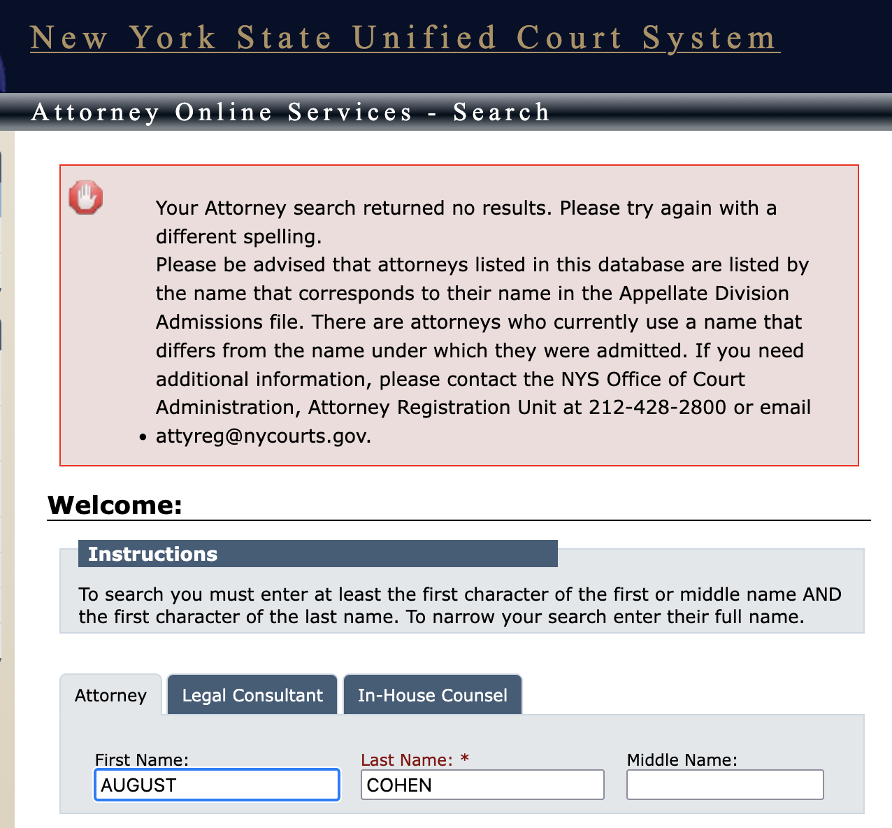 To be fair 'August' could be a nickname (I also tried Augustus Cohen which had no result) and there is about a bajillion Cohen's registered as attorney's in NY (as you would expect) with other first namesEither he's lying about being a bar compliant lawyer in NY or he's lying about his name