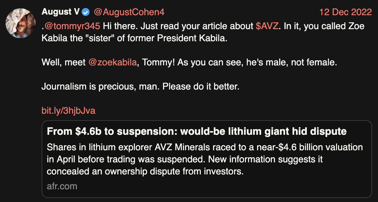The Dude's wife is from the Congo . He comes across to me as being slightly unhinged . Social Media tragic . What kind of idiot put's " Fuck Trump" in big letters on their X profile page .August Cohen on Twitter today doing his best to tell AVZ shareholders we should accept KoBold’s low-ball offer