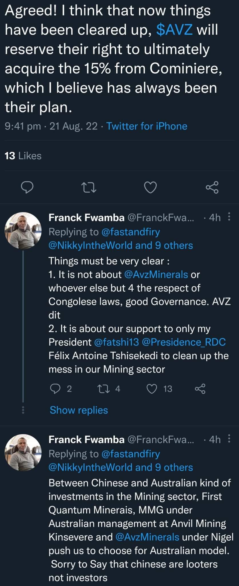 The tweets deleted by Christian Lukusa (screenshots below) were in relation to the offer made by AVZ to Cominiere. It is interesting that his tweet about Zijin being out of Dathcom is still up but everything about AVZ's proposal was removed. Perhaps this was more than the market was supposed to know at this point hint hint.