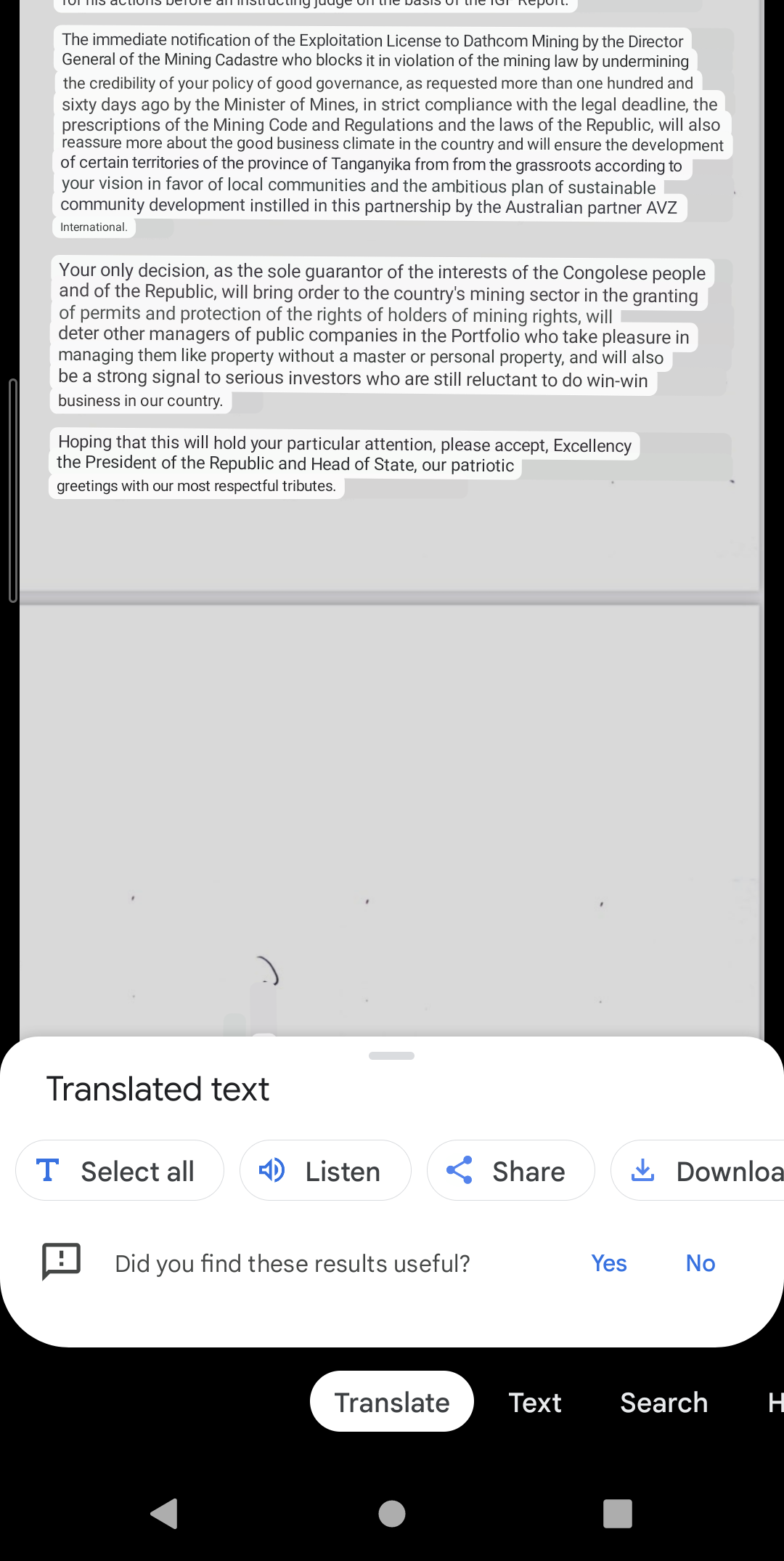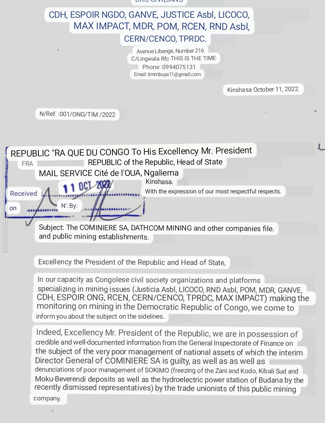Hah! let him mull over that for 6 months!For those not on the Bird here's a translated document from the NGOs to fatshi dated 11th Oct with regards to the going on with the mining Sector and the hold up within.