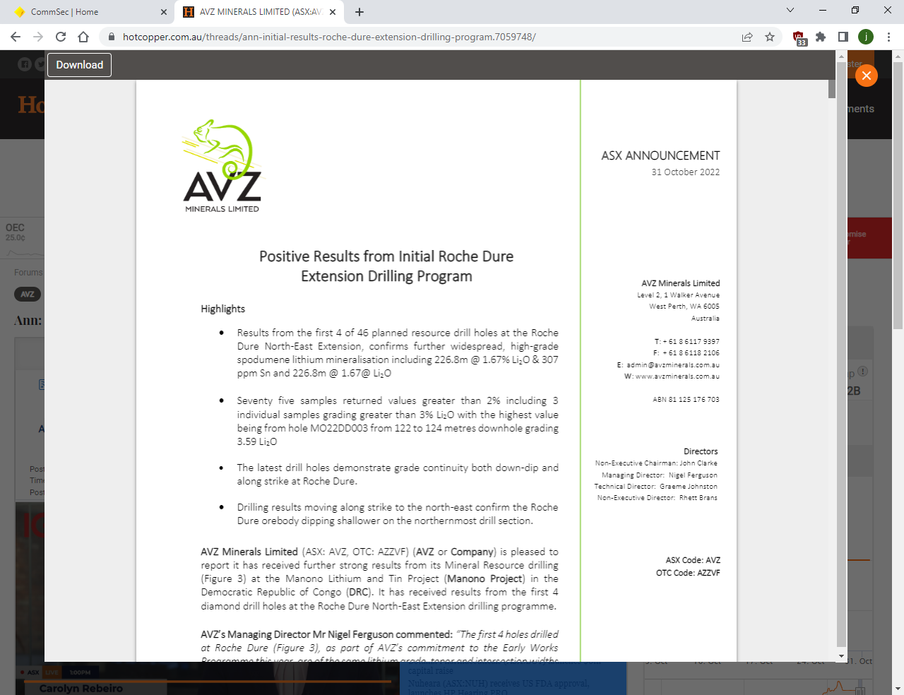 AVZ Minerals Ltd - AVZ Minerals confirms high-grade lithium body extends beyond pit design at Manono’s Roche Dure