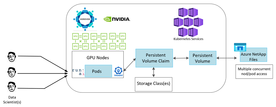 For training, there is a need for good quality and quantity of data. Single GPU or multiple GPUs can take days to weeks to complete the training. Data-distributed training can speed up the process by using multiple and multinode GPUs. Horovod is one such framework that grants distributed training but reading data across clusters of GPUs could act as a hindrance. Azure NetApp Files provides ultrafast, high throughput and sustained low latency to provide scale-out/scale-up capabilities so that GPUs are leveraged to the best of their computational capacity.