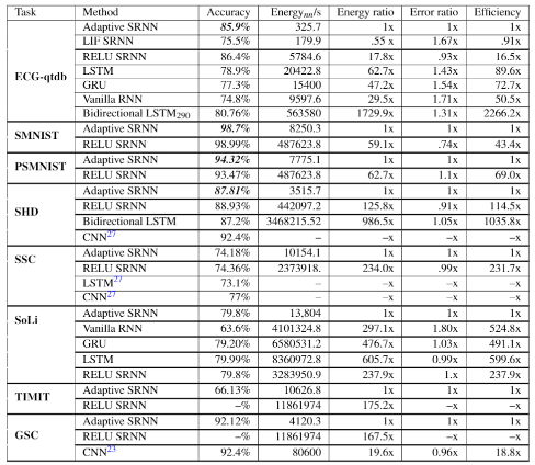 Imec’s adaptive neuron-based SNN (‘Adaptive SRNN’) was evaluated against six other neural networks – using eight different data sets including Google’s radar (SoLi) and Google’s speech datasets