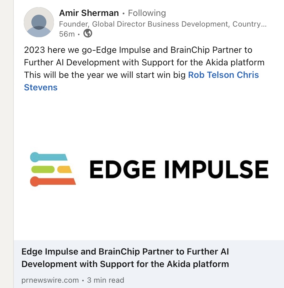2023 here we go-Edge Impulse and BrainChip Partner to Further AI Development with Support for the Akida platform This will be the year we will start win big Rob Telson Chris Stevens https://lnkd.in/dikXH-Vdwww.linkedin.com