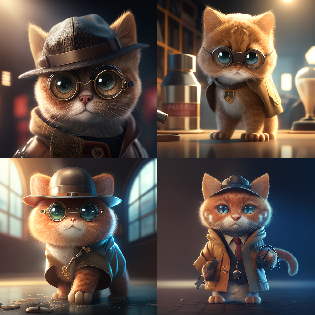 cute cat, super hero detective, Bravo name, AI, part robot ,CGI,2D,highly resolution,elegant, happy,hyper realistic,8K