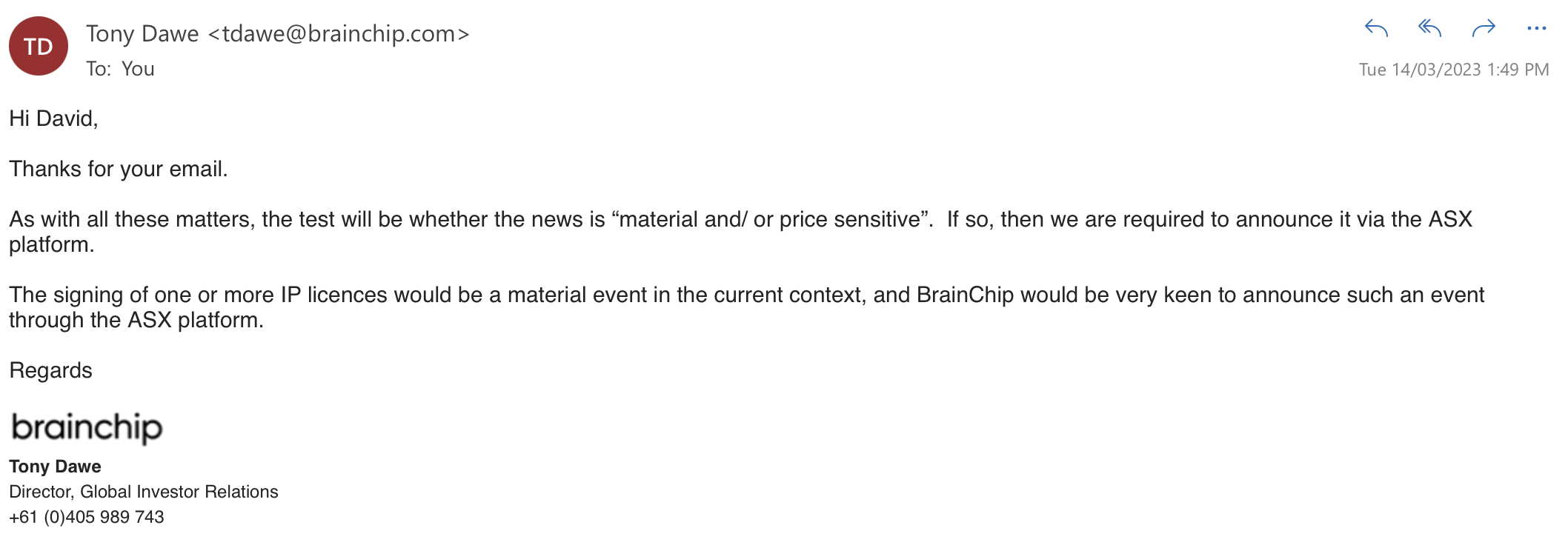 I pressed TD about whether that would possibly mean multiple ASX announcements with ARM and he replied: