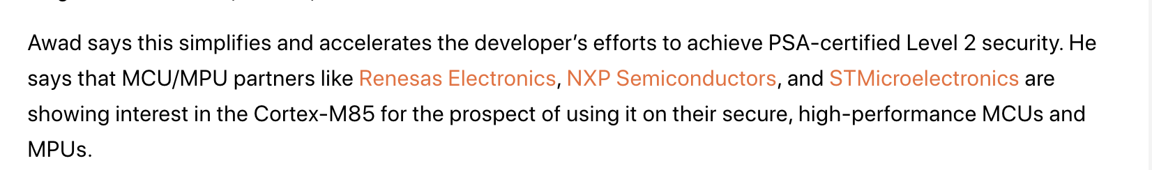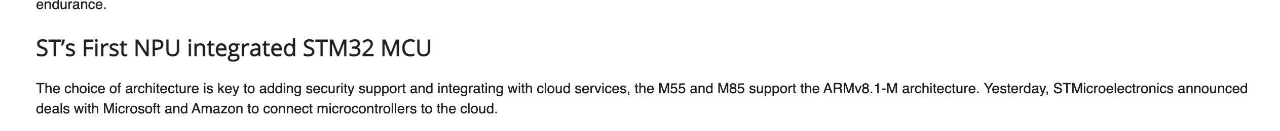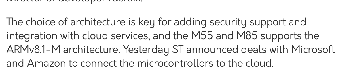 It says here that STMicroelectronics use the Arm Cortex M85 for their high performance MCUs and MPUs and they previously announced deals with Microsoft and Amason to connect the microcontrollers to the cloud.
