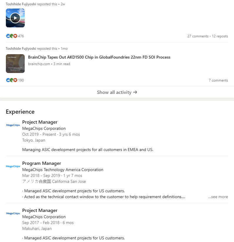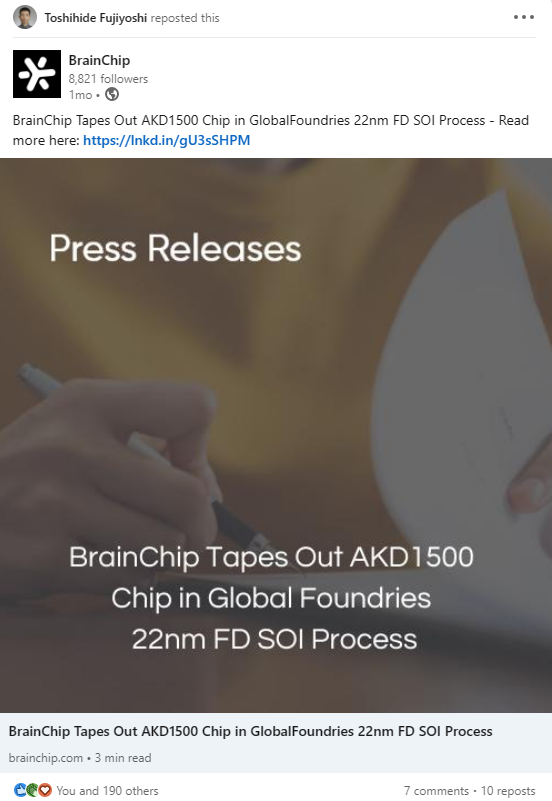 Toshihide Fujiyoshi is the Project Manage from MegaChips & he reposted the press release - BrainChip Tapes Out AKD1500 Chip in Global Foundries 22nm FD SOI.