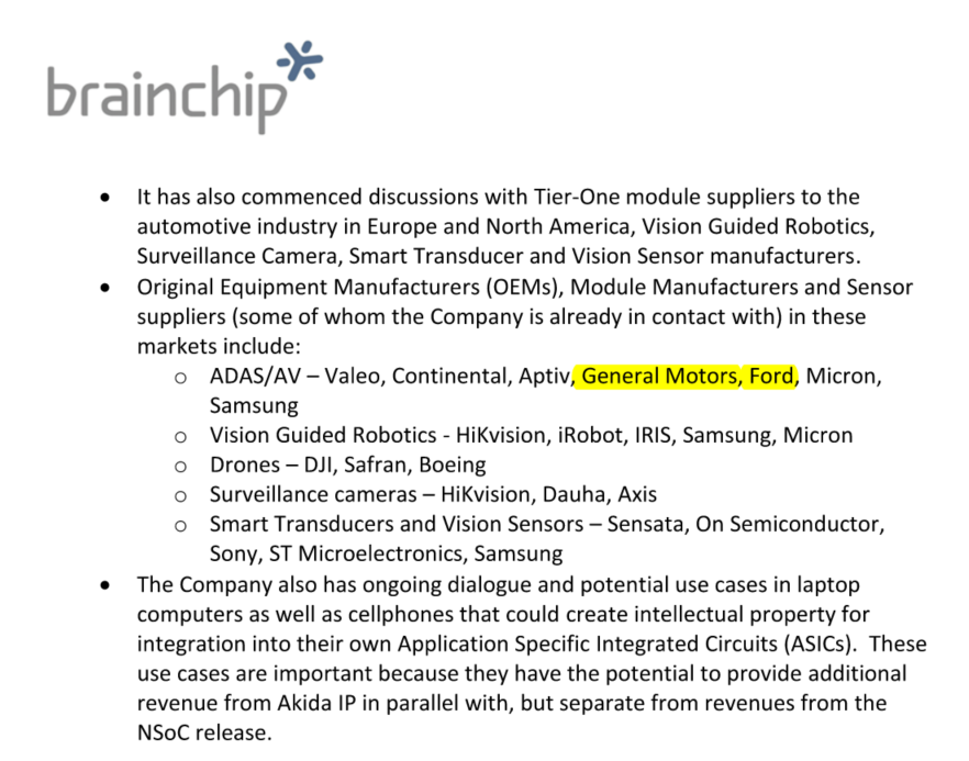I saw back in the ASX Announcement: Update for the March 2019 Quarter that both GM and Ford were mentioned. Looks like things were looser back then as the companies listed are not confirmed as being associated with BrainChip. However some of the other companies listed are now directly involved with BrainChip - well Valeo and Safran anyway, along with Ford
