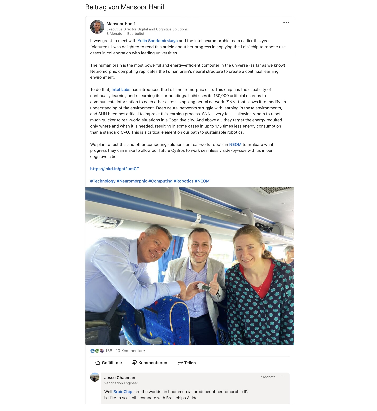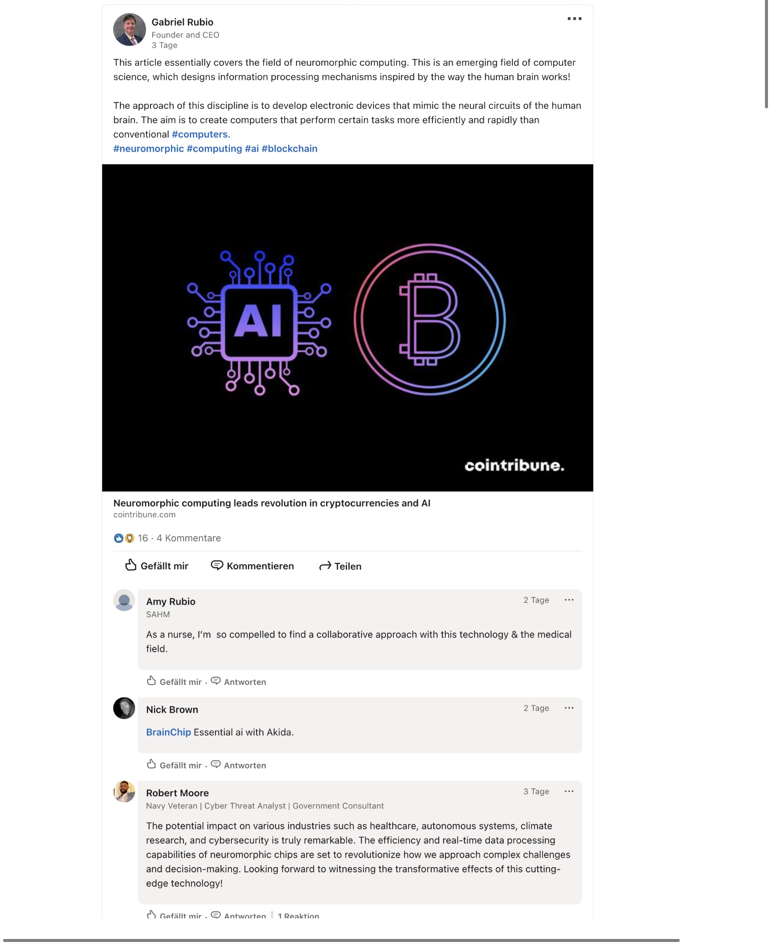 I am aware that the above article on neuromorphic computing that Gabriel Rubio, CEO of SecuRED (a small business “specialising in innovative security and privacy technology solutions including AI”) shared on LinkedIn, has been posted here a couple times of before, but check out the comment section.