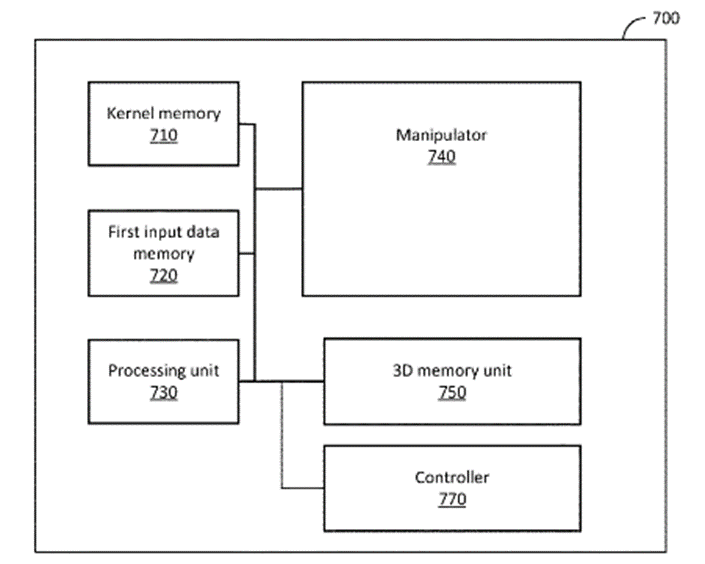 [0103] The neural network processor 700 includes kernel memory 710 , a first input data memory 720 , a 3D memory unit 750 , a hardware processing unit 730 , a manipulator 740 , and a controller 770 . The controller 770 is configured to control the neural network processor 700 . Kernel memory 710 is configured to store a group of kernels utilized in neural network processing. The first input data memory 720 is configured to store first layer input data, such as the 2D first input values 401 illustrated above with respect to FIG. 4. In some embodiments, the 3D memory unit 750 includes the structure illustrated with respect to FIG. 9. In these embodiments, the 3D memory unit 750 includes data paths between at least some corresponding storage elements in adjacent rows of the 3D memory unit 750 , as illustrated above with respect to FIG. 9 and data path 661.